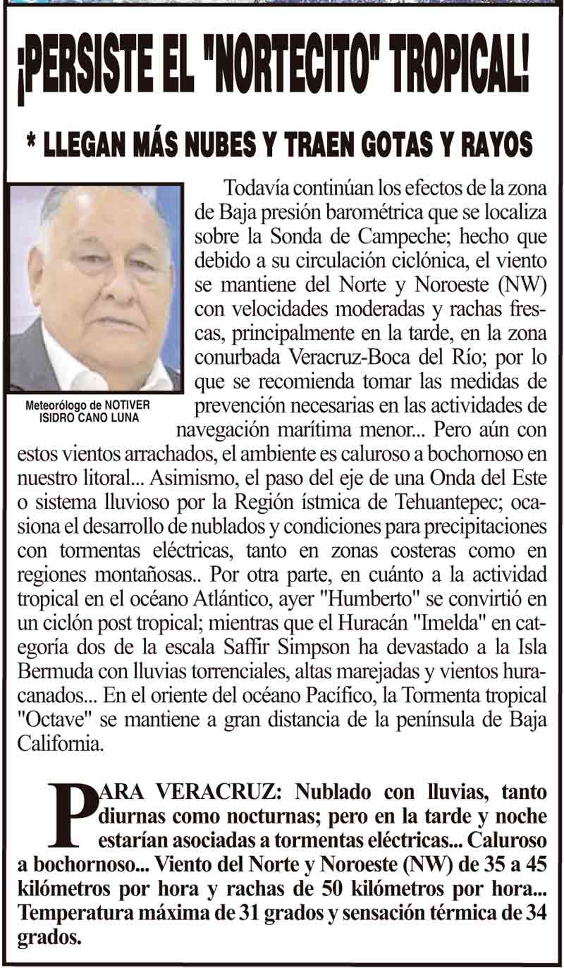 PRIMERA ¡PERSISTE EL "NORTECITO" TROPICAL! - *LLEGAN MÁS NUBES Y TRAEN GOTAS Y RAYOS 2 octubre 2025 Más Noticias LA ENCUESTA | - ME ESTÁS OYENDO INÚTIL?... ¡CON BAILONGOS QUIEREN AYUDAR A LOS DAMNIFICADOS DEL NORTE! - *El mismo Alor, toca los timbales ¡YA SE LA APROBARON! - REFORMA PARA LA FISCALÍA ESTATAL NOTI-MEME | - ASÍ ESTUVO EL INFORME... ¡MÁS DE 9 MIL MILLONES! - *Eso costaría cancelar en Veracruz al Grupo MAS ¡LE DAN LUZ VERDE! - DESDE GUATEMALA ¡EL CUARTO! ¡Y COM-PA-RE-CIÓ! - ÁNDALE... ¡NO SE VA LISBETH AURELIA! - *Descarta ir a la Fiscalía y que seguirá como magistrada ¡CREAN EL SÚPER MAÍZ!