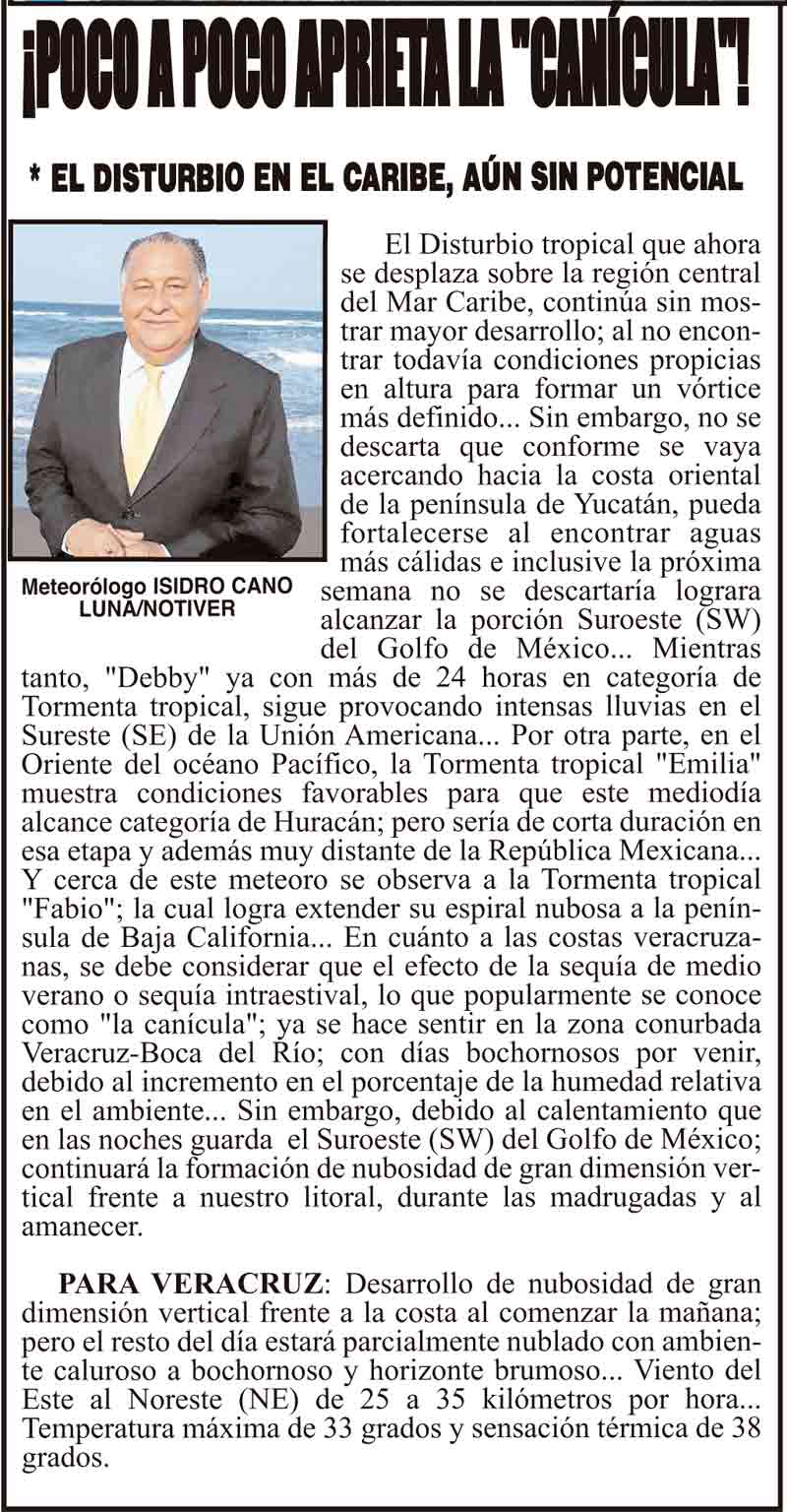PRIMERA ¡POCO A POCO APRIETA LA "CANÍCULA"! - *EL DISTURBIO EN EL CARIBE, AÚN SIN POTENCIAL 7 agosto 2024 Más Noticias ¡YA HAY TERNA! - RAÚL PEIMBERT EN LA LISTA ¡“CEMENTERIO”! - DE ULÚAS ¡INAUGURA PATY OTRA CALLE! ¡NO LE CREYERON! - Y LO BUSCAN NOTI-MEME | - ECOS DEL INFORME! ¡VERÓNICA VA CON NAHLE! - Y AL CONGRESO ¡“FAST TRACK”! - *Mientras el Mariner salía y entraba de Pajaritos en Coatzacoalcos ¡OPERATIVO LUPE-REYES! ¡MANDAN LA BILLETIZA! - *Corea manda 150 mil dólares ¡CRISTINA GANA LA ELECCIÓN!