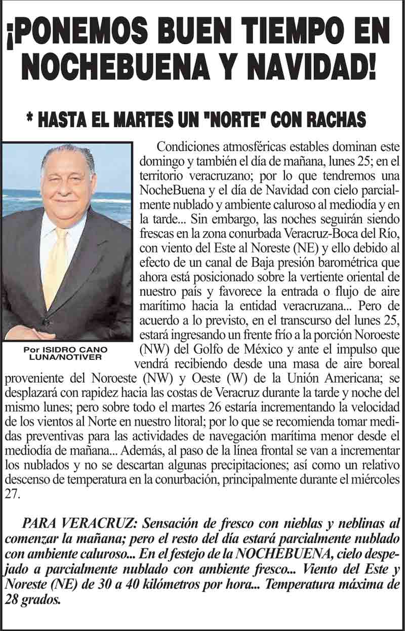 PRIMERA ¡PONEMOS BUEN TIEMPO EN NOCHEBUENA Y NAVIDAD! * HASTA EL MARTES UN "NORTE" CON RACHAS 24 diciembre 2023 Más Noticias ¡YA HAY TERNA! - RAÚL PEIMBERT EN LA LISTA ¡“CEMENTERIO”! - DE ULÚAS ¡INAUGURA PATY OTRA CALLE! ¡NO LE CREYERON! - Y LO BUSCAN NOTI-MEME | - ECOS DEL INFORME! ¡VERÓNICA VA CON NAHLE! - Y AL CONGRESO ¡“FAST TRACK”! - *Mientras el Mariner salía y entraba de Pajaritos en Coatzacoalcos ¡OPERATIVO LUPE-REYES! ¡MANDAN LA BILLETIZA! - *Corea manda 150 mil dólares ¡CRISTINA GANA LA ELECCIÓN!