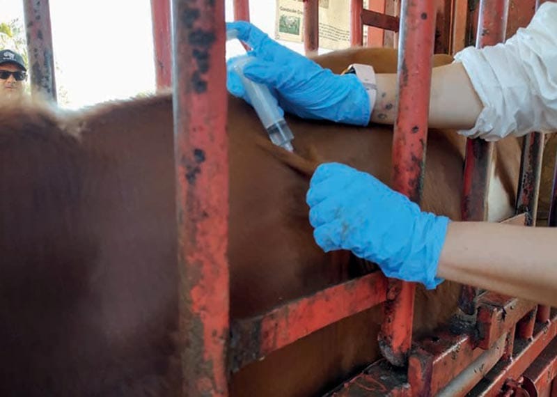 Se prevé que el ganado permanezca en los corrales sanitarios durante seis días, periodo en el que el personal autorizado coloca el arete sanitario, marca al ganado con las siglas CN (consumo nacional), realiza pruebas de tuberculosis bovina (Tb) y brucelosis (Br) e inspecciona a todos los animales, para descartar la presencia de garrapatas Boophilus spp., además de aplicar tratamiento a heridas, con desparasitantes y baño de aspersión con productos larvicidas, para prevenir el gusano barrenador del ganado.