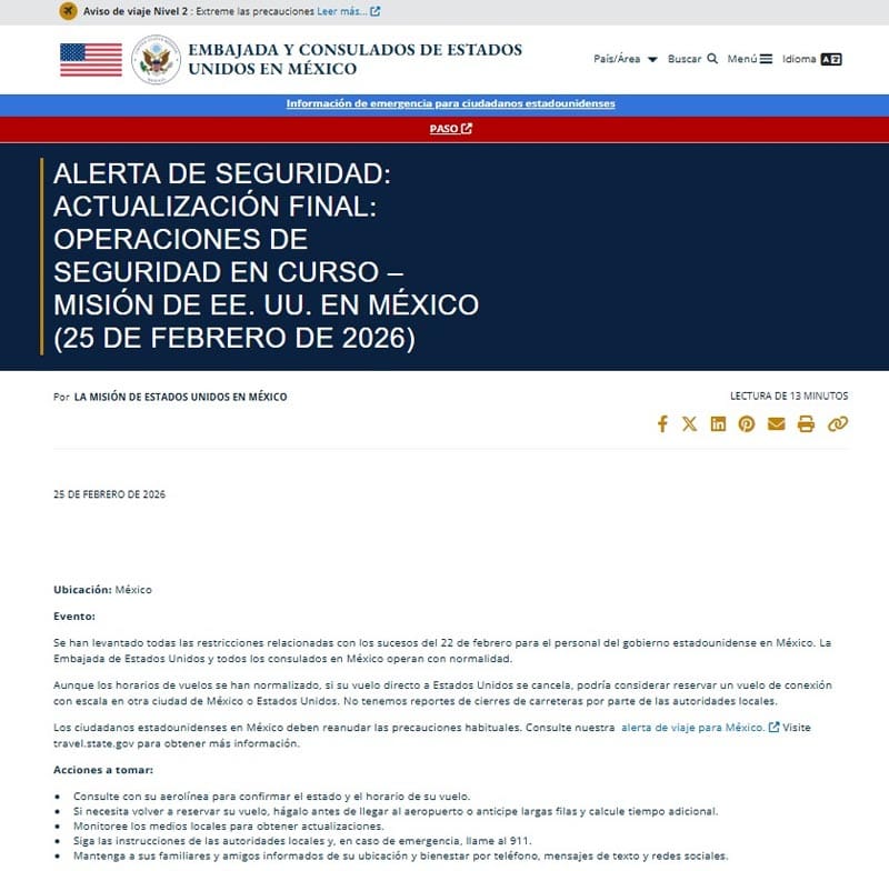 Esta medida se da en un contexto donde, si bien se han levantado las restricciones temporales impuestas tras los sucesos del pasado 22 de febrero, la vigilancia sobre la seguridad en el territorio mexicano permanece activa.