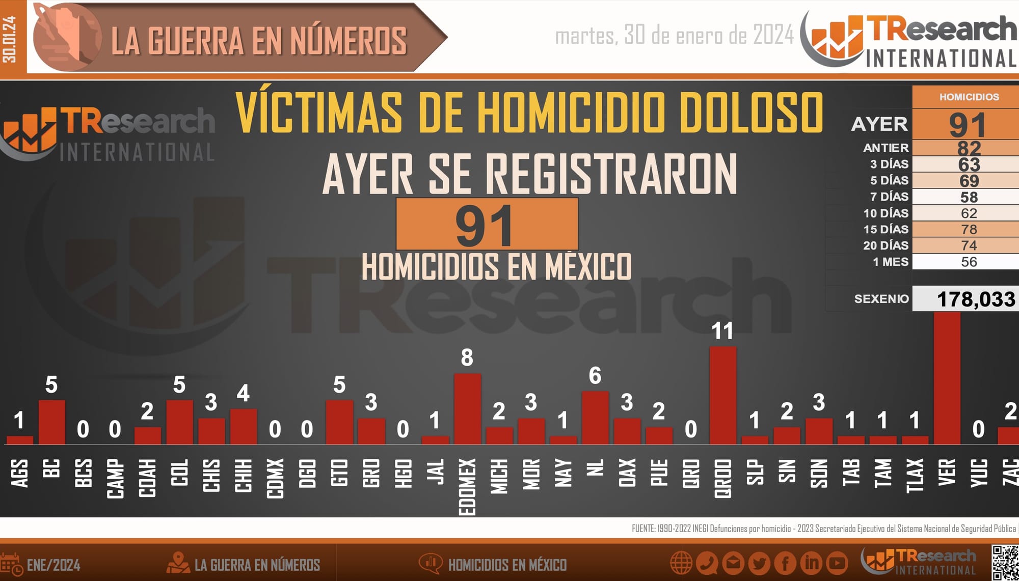 Trascendió que el 29 de enero se registraron 91 homicidios reportados por las Fiscalías Estatales y Dependencias Federales de todo el país.