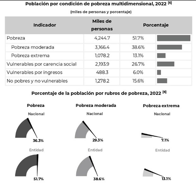 En cuanto a la pobreza solamente un 15.6% de la población son catalogados como no pobres y no vulnerables, un 6% en vulnerabilidad por ingresos, 26.7% vulnerables por carencia social, 13.1% en extrema, 38.6% en pobreza moderada y 51.7% en pobreza.