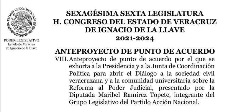 La diputada Maribel Ramírez Topete presentó a la Diputación Permanente un Anteproyecto con Punto de Acuerdo, por el cual solicita abrir el diálogo a la sociedad civil veracruzana y a la comunidad universitaria sobre la Reforma al Poder Judicial, con la finalidad incluir las aportaciones de todas y todos.