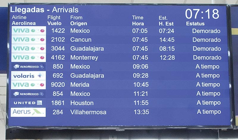 El vuelo 2103 de Viva Aerobús, programado para aterrizar a las 07:45 horas, en ruta Cancún-Veracruz, se retrasó por mal tiempo y llegaría a las 14:45 horas.