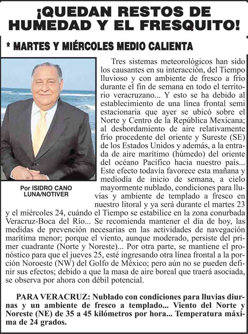 PRIMERA ¡QUEDAN RESTOS DE HUMEDAD Y EL FRESQUITO! * MARTES Y MIÉRCOLES MEDIO CALIENTA 22 enero 2024 Más Noticias ¡SOS EN ARROYO MORENO! - SE HACE CHIQUITO ¡“LO VAMOS A EXTRAÑAR”! - *“Yo y mis hijos”, lamenta la ex alcaldesa Paty Lobeira ¡NACE COALICIÓN DE MANIOBRISTAS! - *Con auténticos socios accionistas ¡DETIENEN A FAMILIARES DE REVERIANO PÉREZ! - EL EX ALCALDE DE COXQUIHUI ¡CLAUDIA DICE NO! - AL ALZA DEL COSTO DE LA TORTILLA NOTI-MEME | - HOMENAJE A PEDRITO! ¡MAÑANITAS A NAHLE! - LLEGÓ A 62 AÑOS, BIEN VIVIDOS ¡REVIENTAN ABOGADOS! - POR CATEOS DISFRAZADOS ¡BLOQUEO DE EX POLICÍAS! - *Exigen pagos pendientes desde 2015 LA ENCUESTA | - ASFALTARÁN CON GOTITAS!
