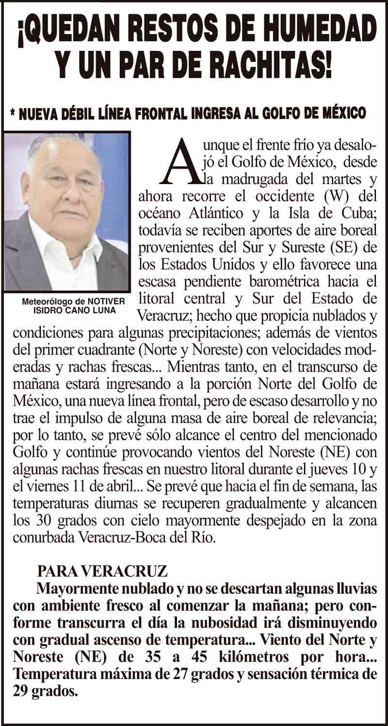 PRIMERA ¡QUEDAN RESTOS DE HUMEDAD Y UN PAR DE RACHITAS! - *NUEVA DÉBIL LÍNEA FRONTAL INGRESA AL GOLFO DE MÉXICO 9 abril 2025 Más Noticias ¡SE NUBLA Y LLUEVE CON DOS RAYOS Y NORTECITO! - *PERO MAÑANA DESPEJA Y ACALORA ¡LA PREMIAN EN LA UV! - A SÚPER ESTUDIANTE ¡ACATAN SENTENCIA! - CASO ASCENSIO ¡OPERATIVO “SALVAVIDAS”! ¡TAMBIÉN TAMBORES DE GUERRA! - UYUYYYY ¡VIRGILIO TORRES A TRÁNSITO! - *Era el segundo de Andrés Delgado, en la delegación de Medellín ¡EJECUTAN A LÍDER DE TAXISTAS! - EN ACAYUCAN ¡TIENEN MELLO! - AY NANITAS ¡CUMPLE MANDINGA 425 AÑOS! - *Viene un Príncipe de Camerún NOTI-MEME | - ''LOS GRINCHS''