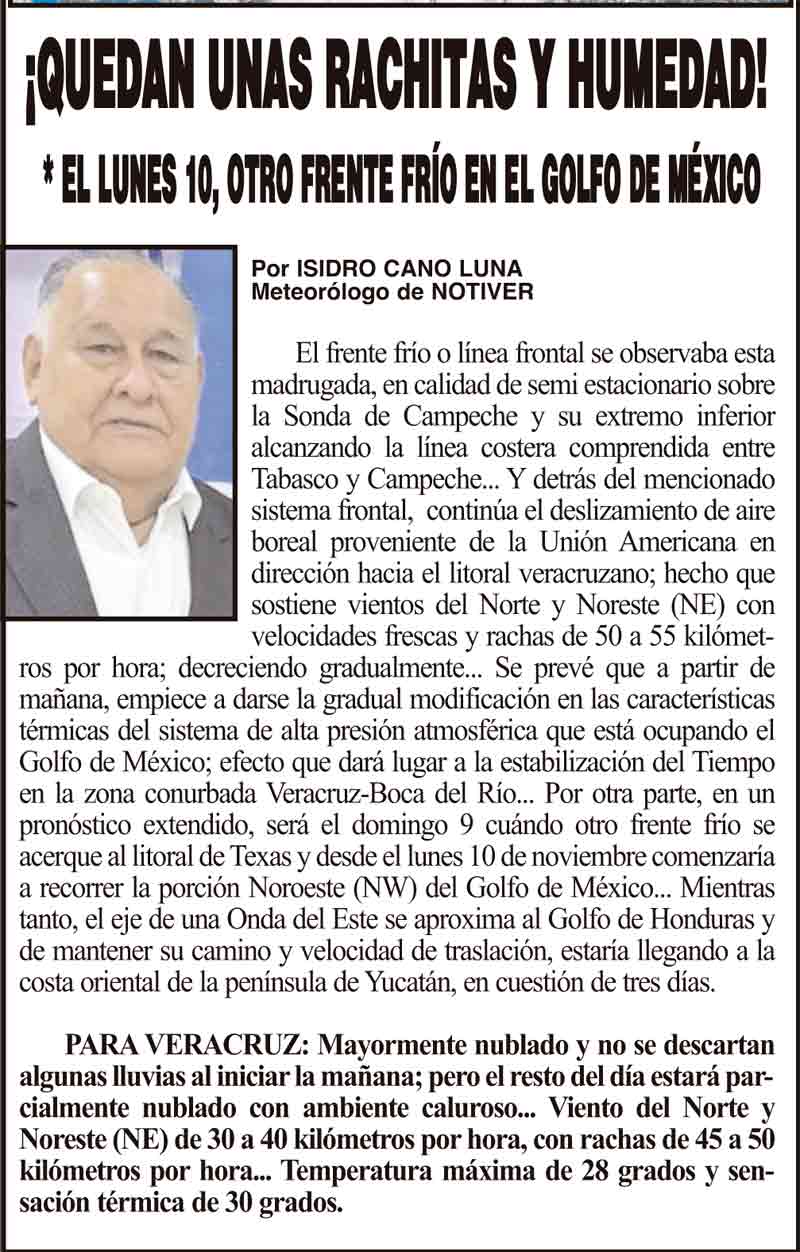 PRIMERA ¡QUEDAN UNAS RACHITAS Y HUMEDAD! - *EL LUNES 10, OTRO FRENTE FRÍO EN EL GOLFO DE MÉXICO 4 noviembre 2025 Más Noticias ¡ATRAPADOS! - HAY VERACRUZANOS ¡MUERE FAMILIA EN INCENDIO! - TRAGEDIA EN RÍO BLANCO ¡CAMIONES CHINOS A XALAPA! ¡SE LES APARECE MARYJOSE! LOS CARTONES FUE LA PERCEPCIÓN TÉRMICA... ¡MEGA-OPERATIVO POR CABALGATA! - *Cierres viales y de limpieza por Cabalgata nacional en Veracruz puerto NOTI-MEME | - NO AGUANTAN EL CALOR!! ¡HASTA GRANIZÓ! - PURAS BOLAS ¡CAYÓ EN XALAPA! - *Se repartirán ocho millones y medio