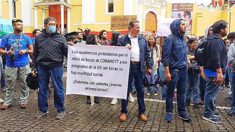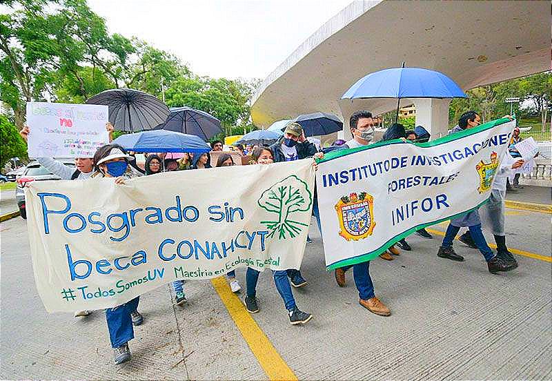 Bajo la lluvia, decenas de estudiantes de la Universidad Veracruzana que cursan maestrías, doctorados, especialidades, salieron a las calles en la capital del Estado, para reprobar la repentina decisión del Consejo Nacional de Humanidades, Ciencias y Tecnologías (Conahcyt) de retirar las becas.