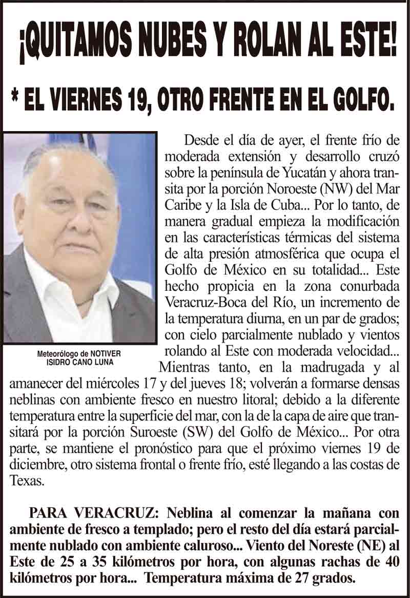PRIMERA ¡QUITAMOS NUBES Y ROLAN AL ESTE! - *EL VIERNES 19, OTRO FRENTE EN EL GOLFO. 16 diciembre 2025 Más Noticias LA PORTADA - MARTES 16 DE DICIEMBRE 2025 ¡PUROS CALAMBRES! - AY NANITAS ¡OTRO GOLPE DE TIMÓN! - *Habrá guardias en los Registros Civiles para trámites urgentes ¡LE METIÓ ENEDINO 10 MILLONES DE PESOS A LA EDUCACIÓN EN JAMAPA! ¡MUERE FOTOPERIODISTA! - *Ramiro Cárdenas Acua conocido como El Fotógrafo ¡BBVA ESTÁ ABRIENDO CUENTAS DE NÓMINA SIN AVAL DE LA SEV! ¡YA TIENE 32 AÑOS LA ASIPONA! ¡LOS RECORDARÁN! ¡MÁS PROYECTOS COMERCIALES EN ZONA CONURBADA! ¡NO SE LOGRÓ! - *Mujeres ganan 53 alcaldías, pero los hombres se quedan con 158