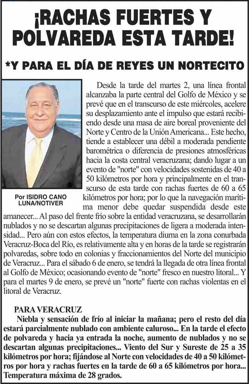 PRIMERA ¡RACHAS FUERTES Y POLVAREDA ESTA TARDE! *Y PARA EL DÍA DE REYES UN NORTECITO 3 enero 2024 Más Noticias LA PORTADA - VIERNES 5 DE DICIEMBRE 2025 ¡HOY SOPLA FRESCO Y DE FRENTE! - *PERO EL LUNES 8, ESTARÁ FUERTE Y CON LLUVIAS. LA ENCUESTA | - ME ESTÁS OYENDO INÚTIL?... ¡CON BAILONGOS QUIEREN AYUDAR A LOS DAMNIFICADOS DEL NORTE! - *El mismo Alor, toca los timbales ¡YA SE LA APROBARON! - REFORMA PARA LA FISCALÍA ESTATAL NOTI-MEME | - ASÍ ESTUVO EL INFORME... ¡MÁS DE 9 MIL MILLONES! - *Eso costaría cancelar en Veracruz al Grupo MAS ¡LE DAN LUZ VERDE! - DESDE GUATEMALA ¡EL CUARTO! ¡Y COM-PA-RE-CIÓ! - ÁNDALE...