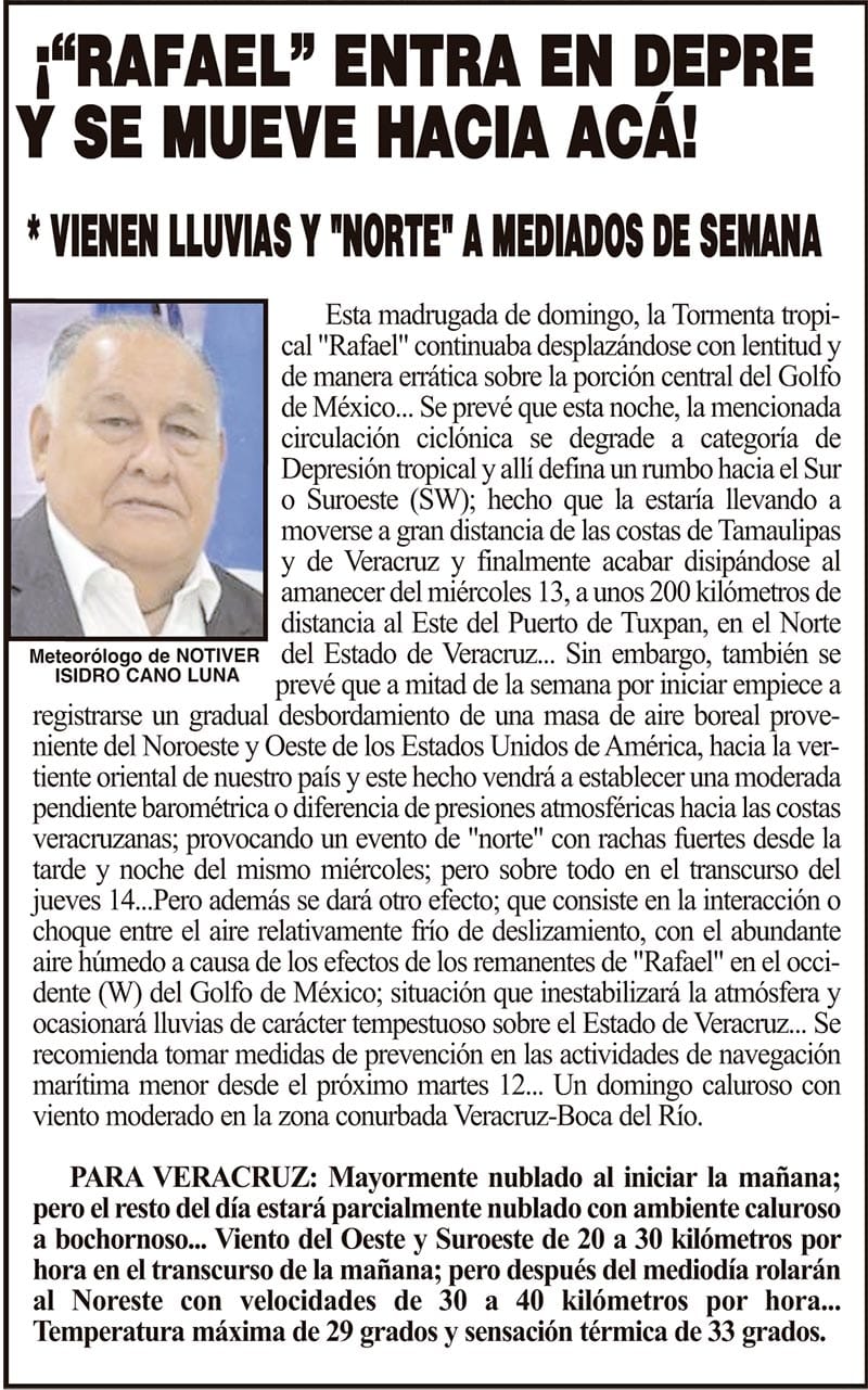 PRIMERA ¡“RAFAEL” ENTRA EN DEPRE Y SE MUEVE HACIA ACÁ! - *VIENEN LLUVIAS Y "NORTE" A MEDIADOS DE SEMANA 10 noviembre 2024 Más Noticias ¡YA HAY TERNA! - RAÚL PEIMBERT EN LA LISTA ¡“CEMENTERIO”! - DE ULÚAS ¡INAUGURA PATY OTRA CALLE! ¡NO LE CREYERON! - Y LO BUSCAN NOTI-MEME | - ECOS DEL INFORME! ¡VERÓNICA VA CON NAHLE! - Y AL CONGRESO ¡“FAST TRACK”! - *Mientras el Mariner salía y entraba de Pajaritos en Coatzacoalcos ¡OPERATIVO LUPE-REYES! ¡MANDAN LA BILLETIZA! - *Corea manda 150 mil dólares ¡CRISTINA GANA LA ELECCIÓN!