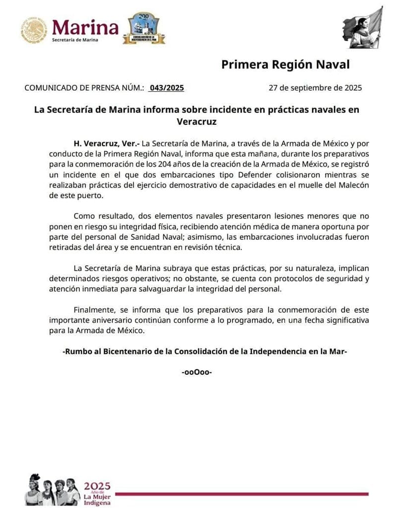 La Marina emitió un comunicado y dijeron que a través de la Armada de México y por conducto de la Primera Región Naval se informaba sobre el incidente.