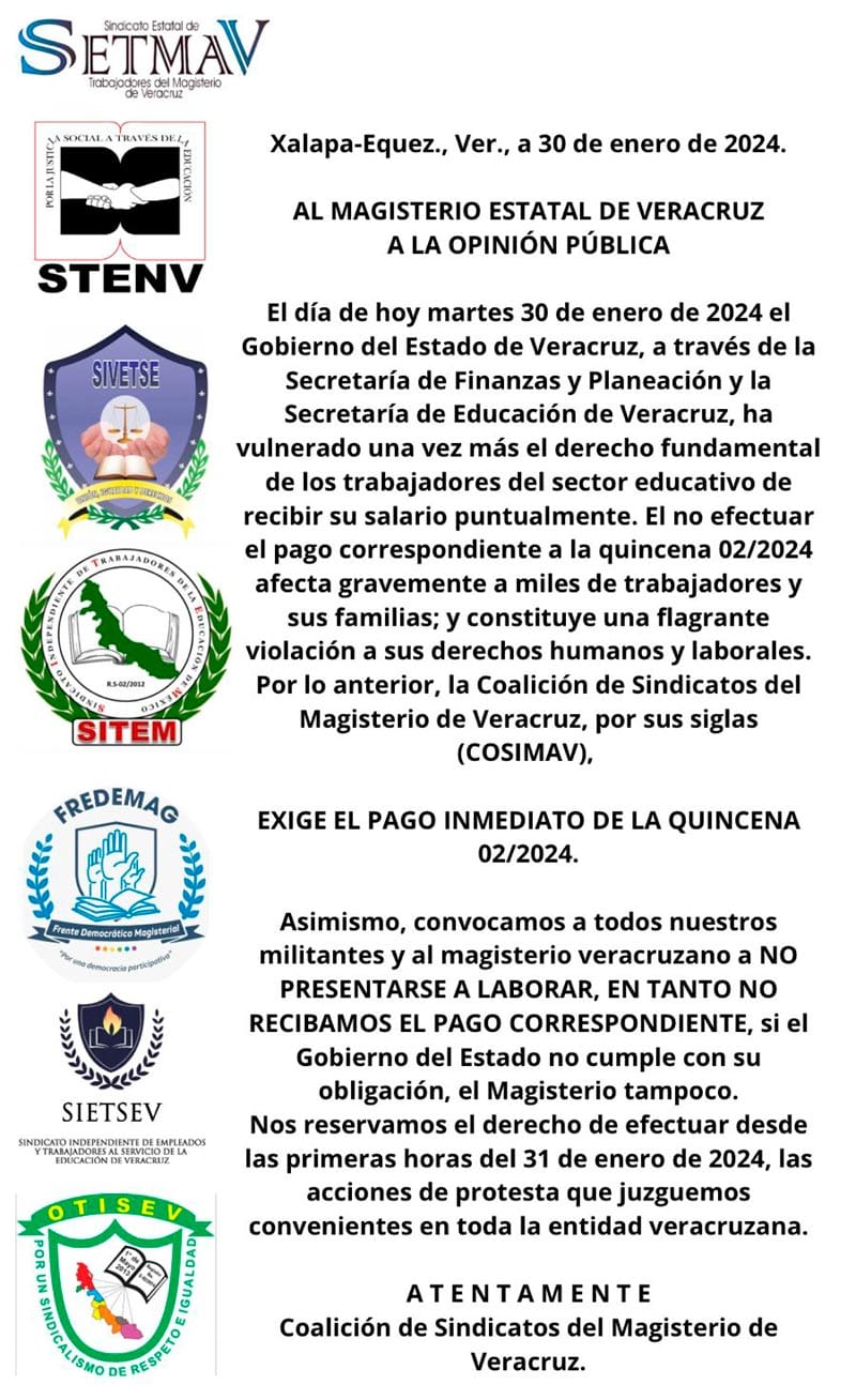 “En diciembre, sucedió exactamente lo mismo, hubo un error de fechas y lo dejamos pasar, esta bien, somos humanos y cometemos errores, pero por ley, tienen que pagar los días 15 y 30, por lo cual la delegación X, Veracruz, del Sindicato Democrático, el día de mañana (miércoles) no van a presentarse a trabajar”.