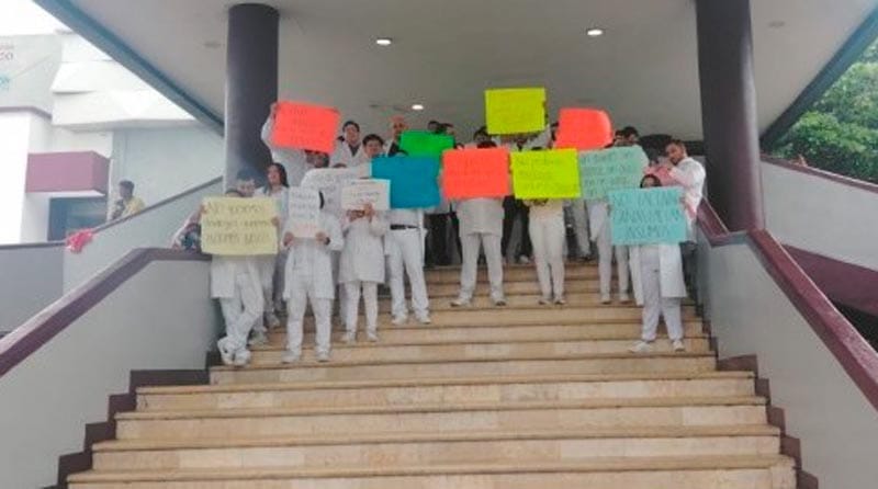 Médicos residentes del Hospital de Alta Especialidad de Veracruz (HAEV) se manifestaron para denunciar la falta de insumos, lo cual les imposibilita para realizar sus prácticas profesionales.