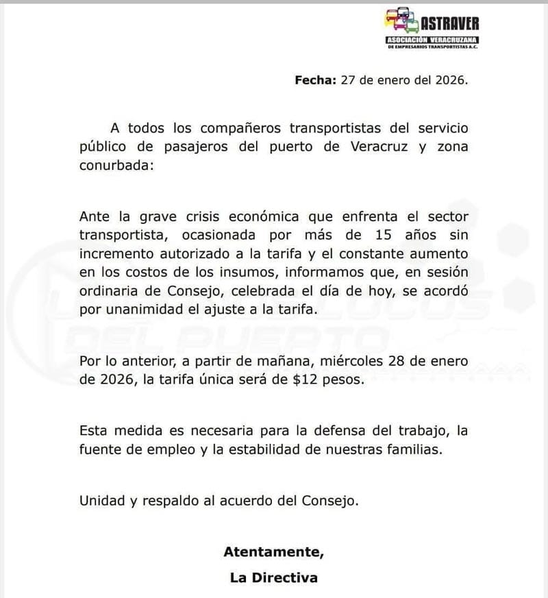 “Por lo anterior, a partir de mañana, miércoles 28 de enero de 2026, la tarifa única será de $12 pesos. Esta medida es necesaria para la defensa del trabajo, la fuente de empleo y la estabilidad de nuestras familias”, publicó Astraver.