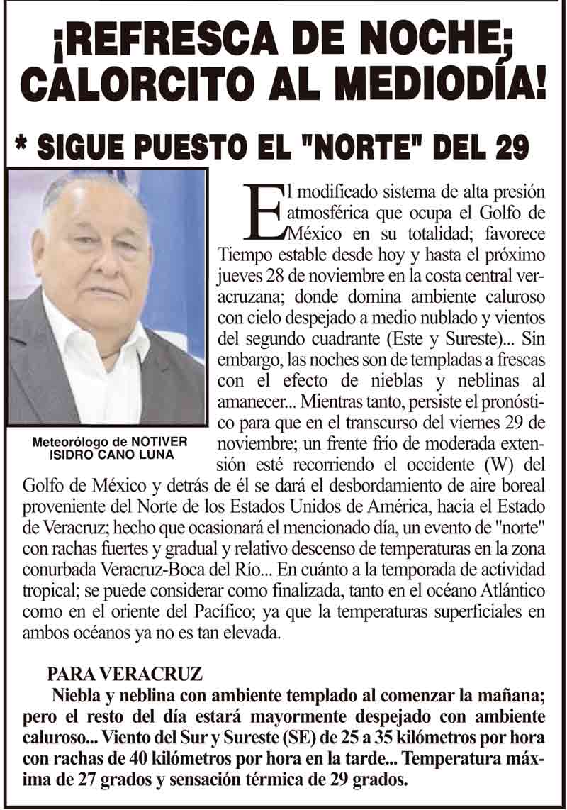 PRIMERA ¡REFRESCA DE NOCHE; CALORCITO AL MEDIODÍA! - *SIGUE PUESTO EL "NORTE" DEL 29 24 noviembre 2024 Más Noticias ¡YA HAY TERNA! - RAÚL PEIMBERT EN LA LISTA ¡“CEMENTERIO”! - DE ULÚAS ¡INAUGURA PATY OTRA CALLE! ¡NO LE CREYERON! - Y LO BUSCAN NOTI-MEME | - ECOS DEL INFORME! ¡VERÓNICA VA CON NAHLE! - Y AL CONGRESO ¡“FAST TRACK”! - *Mientras el Mariner salía y entraba de Pajaritos en Coatzacoalcos ¡OPERATIVO LUPE-REYES! ¡MANDAN LA BILLETIZA! - *Corea manda 150 mil dólares ¡CRISTINA GANA LA ELECCIÓN!