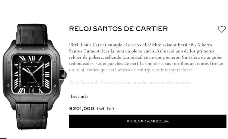 Se trata de un reloj Santos de Cartier color negro, el precio del ejemplar supera los 201 mil pesos mexicanos, modelos similares de la línea tienen precios base que rodean los 11 mil 400 euros.