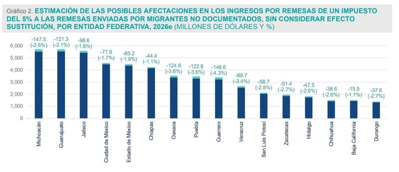 El documento expone que los estado mexicanos que podrían verse más afectados por este gravamen, con la consecuente reducción de los flujos que reciben cada año, serían: Tamaulipas (-4.4%), Guerrero (-4.3%), Puebla (-3.6%), Oaxaca (-3.6%) y Veracruz (-3.4%).