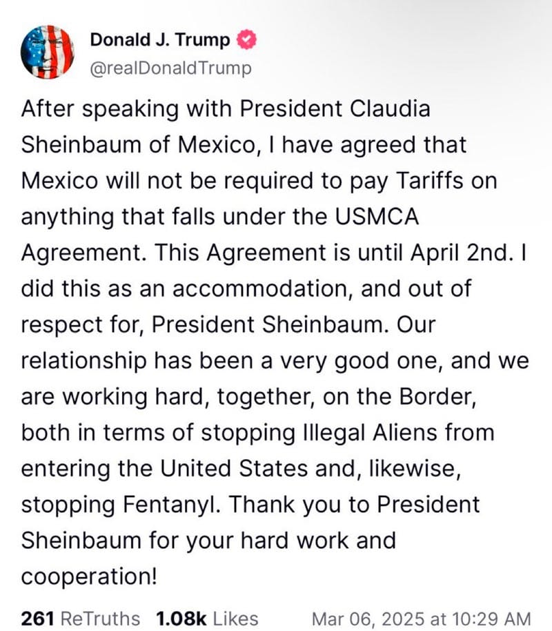 Después de hablar con la presidenta de México, Claudia Sheinbaum, acordamos que México no tendrá que pagar aranceles sobre nada que esté incluido en el Acuerdo T-MEC. Este acuerdo es válido hasta el 2 de abril.