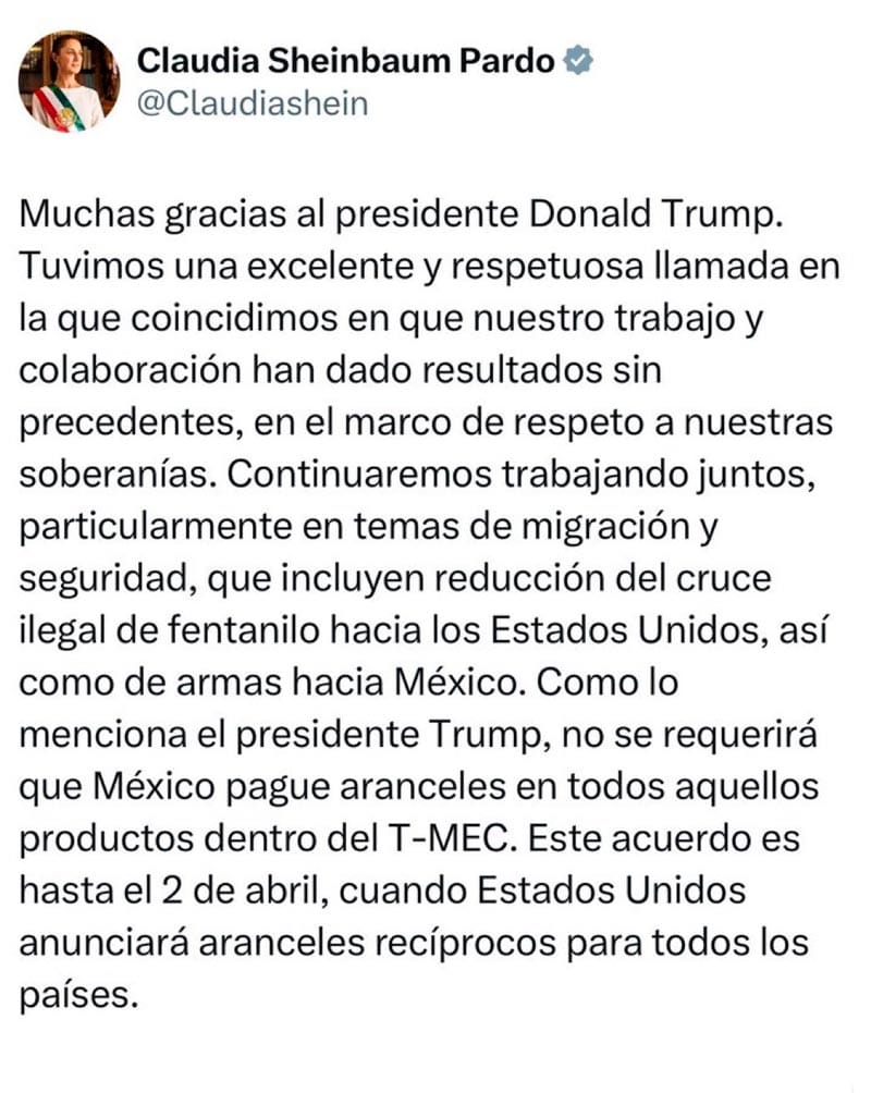 “Este acuerdo se mantiene hasta el 2 de abril, lo hice como acomodo y respeto a la presidenta Sheinbaum”, subrayó el presidente de Estados Unidos en el mensaje que transmitió en su red social luego de concluir la llamada con su homóloga mexicana.