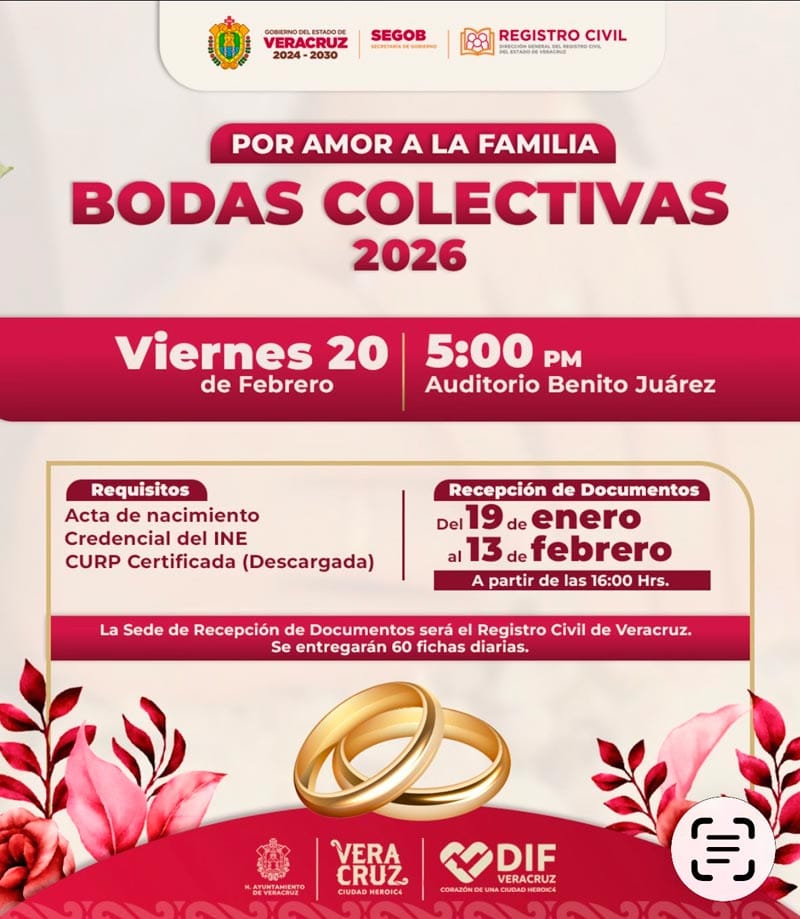 La ceremonia de las Bodas Colectivas se realizará el 20 de febrero del 2026, a las 17:00 horas, en el auditorio Benito Juárez, en el puerto de Veracruz.