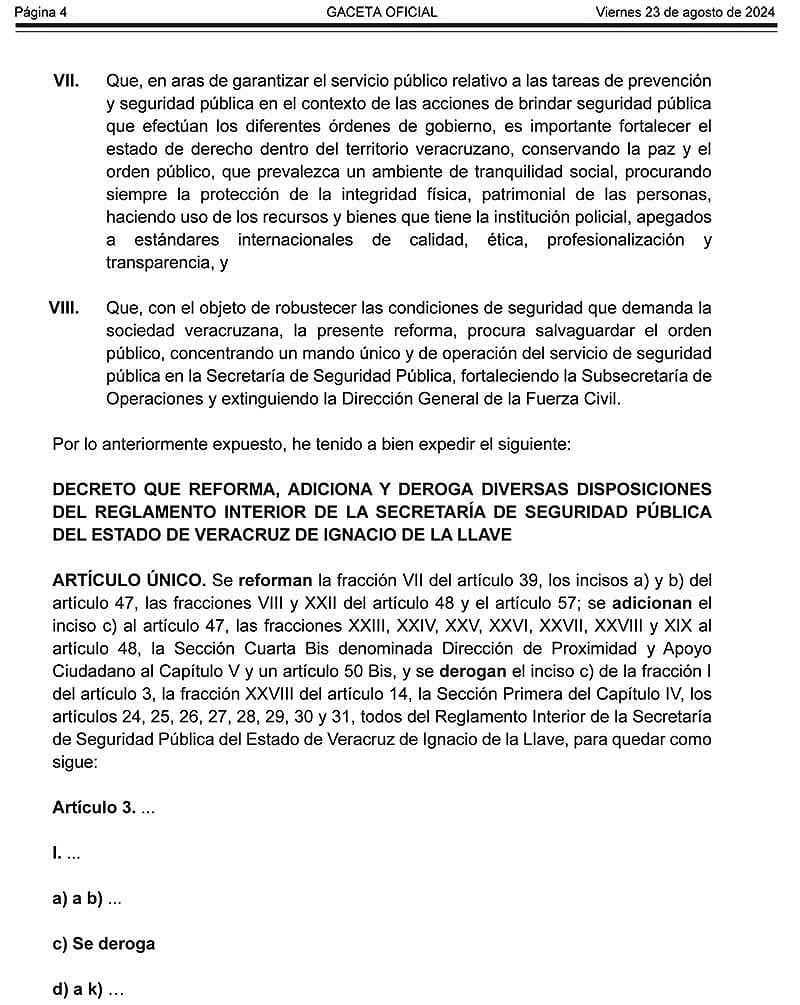 El documento publicado en la Gaceta Oficial señala que mediante una reforma que adiciona y deroga diversas disposiciones del Reglamento Interior de la Secretaría de Seguridad Pública, se concentra un mando único y de operación del servicio de seguridad pública en la Secretaría de Seguridad Pública; se da mayor fortalecimiento a la Subsecretaría de Operaciones; se crea la Dirección de Proximidad y Apoyo Ciudadano y se extingue la Dirección General de la Fuerza Civil.
