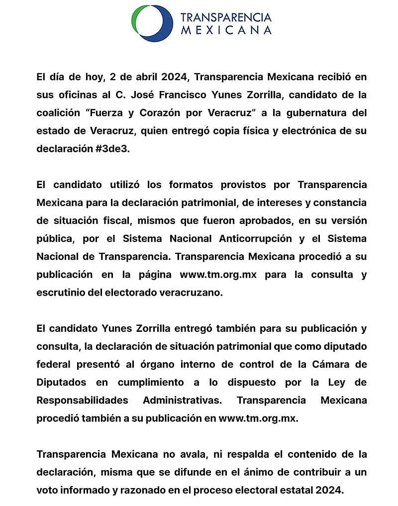 Xalapa, Ver- El candidato del frente opositor del PAN-PRD-PRI, José Yunez Zorrilla presentó su declaración patrimonial, de intereses y constancia de situación fiscal ante la organización transparencia mexicana.