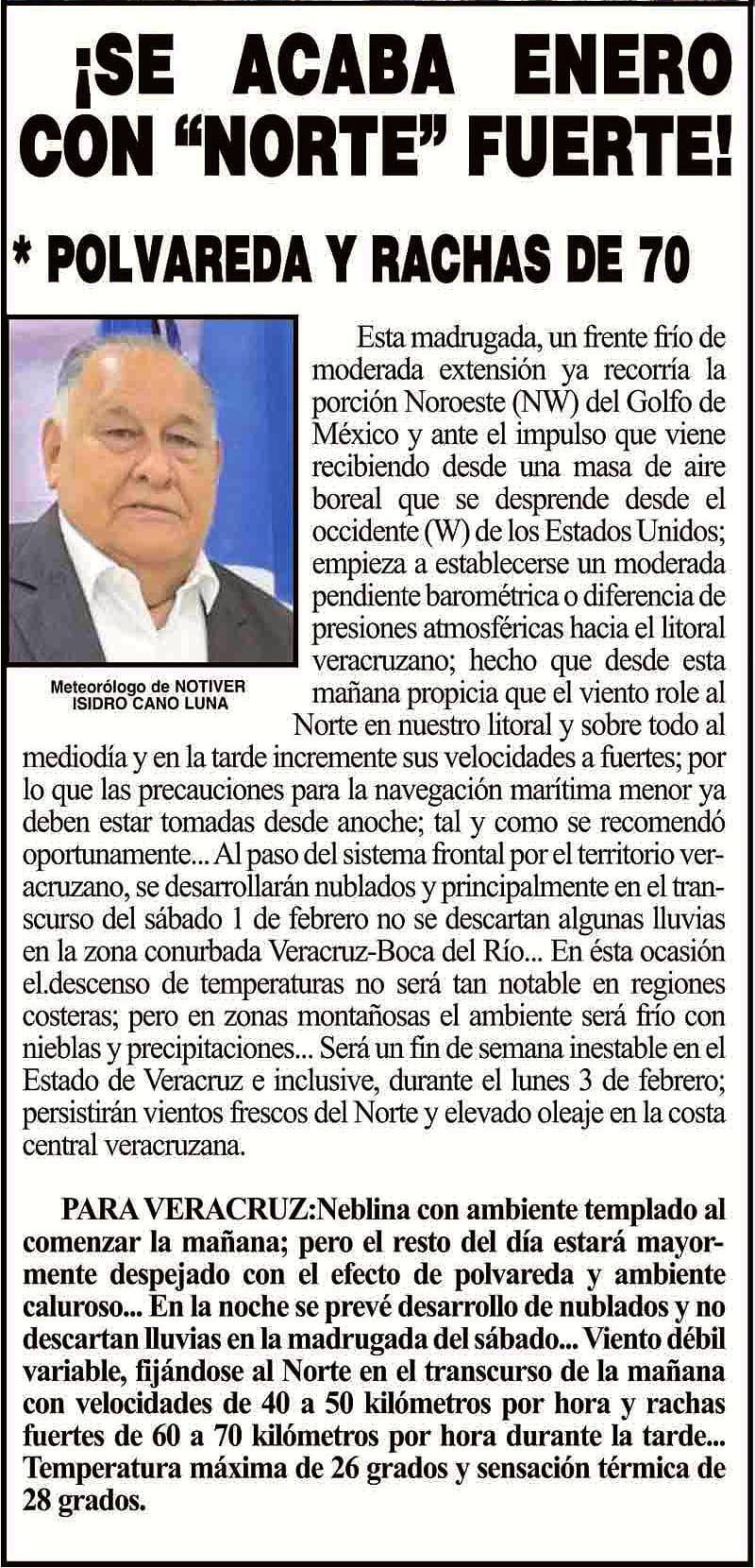 PRIMERA ¡SE ACABA ENERO CON “NORTE” FUERTE! - *POLVAREDA Y RACHAS DE 70 31 enero 2025 Más Noticias ¡NOTIVER NO TIENE COMPETENCIA! - *Ex presidentes Echeverría y Zedillo, compraron Notiver en el Zócalo ¡MOVILIZAN 1,500 RAMBITOS! - *También implantan plan para tomas de protesta ¡VOCEADORES DE NOTIVER! - NI LA LLUVIA, NI EL NORTE... ¡CERROJAZO A LOS FOROS! ¡HAY QUE REZAR! LOS CARTONES ¡TRES AÑOS SIN FÁTIMA! - DESAPARECIÓ TRAS SALIR DE LA ESCUELA ¡YA TENEMOS 51! - Y CONTANDO... ¡FUNDAMENTAL PARA LA LIBERTAD DE EXPRESIÓN ES NOTIVER! - PEIMBERT ¡SUBIÓ TODO! - PA’SU...