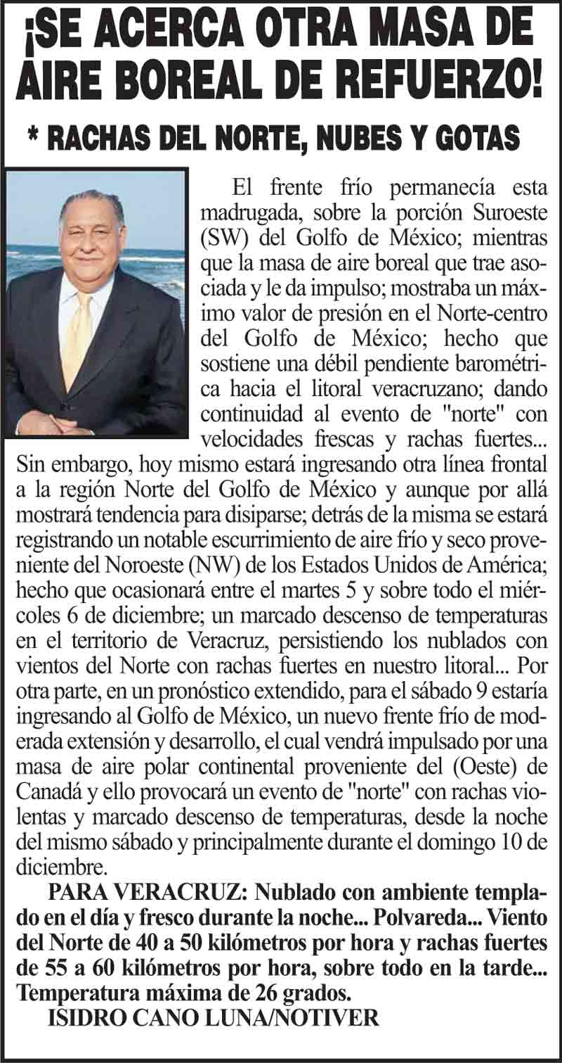 PRIMERA ¡SE ACERCA OTRA MASA DE AIRE BOREAL DE REFUERZO! * RACHAS DEL NORTE, NUBES Y GOTAS 4 diciembre 2023 Más Noticias ¡DANIELA LLEGA A 100 DÍAS! LOS CARTONES ¡“PIRATAS DEL ASFALTO” - NO PARAN ASALTOS LA ENCUESTA | - DICE QUE HA DE SER OTRO DERRAME! ¡SEGUNDO ROUND! - TAN TAN ¡ROYA AFECTA 40 MIL HECTÁREAS DE CULTIVO DE CAFÉ EN VERACRUZ! ¡A GARROTAZOS! - RUDEZA INNECESARIA... ¡A BALAZOS! - SE PASARON... ¡SON DIRIGENTES OBREROS! - LOS BALEADOS DE LA PANCHO VILLA ¡FLAMENCOS SE ESPANTAN CON MÚSICA DE YERI MUA! - *Estaban en etapa de anidación