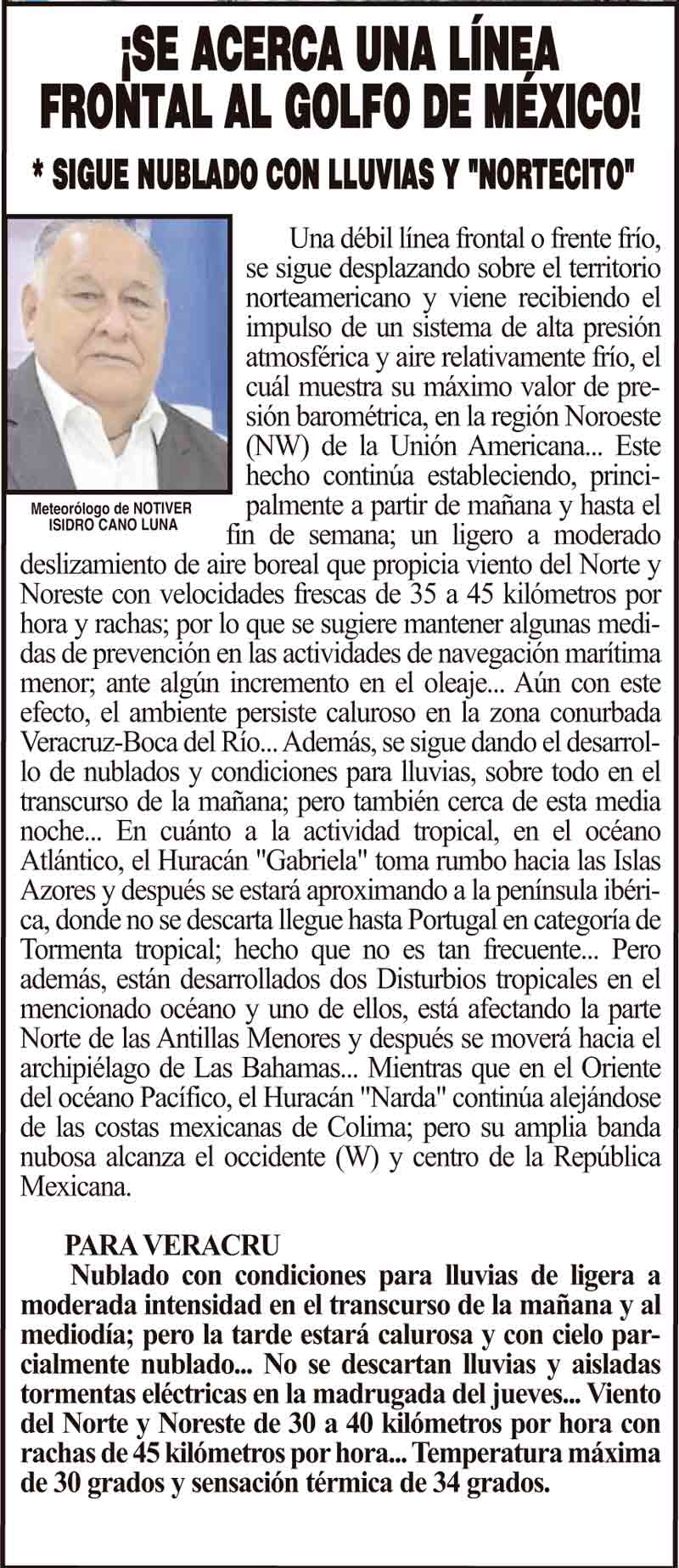 PRIMERA ¡SE ACERCA UNA LÍNEA FRONTAL AL GOLFO DE MÉXICO! - *SIGUE NUBLADO CON LLUVIAS Y "NORTECITO" 24 septiembre 2025 Más Noticias LA ENCUESTA | - ME ESTÁS OYENDO INÚTIL?... ¡CON BAILONGOS QUIEREN AYUDAR A LOS DAMNIFICADOS DEL NORTE! - *El mismo Alor, toca los timbales ¡YA SE LA APROBARON! - REFORMA PARA LA FISCALÍA ESTATAL NOTI-MEME | - ASÍ ESTUVO EL INFORME... ¡MÁS DE 9 MIL MILLONES! - *Eso costaría cancelar en Veracruz al Grupo MAS ¡LE DAN LUZ VERDE! - DESDE GUATEMALA ¡EL CUARTO! ¡Y COM-PA-RE-CIÓ! - ÁNDALE... ¡NO SE VA LISBETH AURELIA! - *Descarta ir a la Fiscalía y que seguirá como magistrada ¡CREAN EL SÚPER MAÍZ!