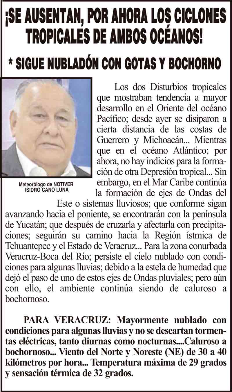 PRIMERA ¡SE AUSENTAN, POR AHORA LOS CICLONES TROPICALES DE AMBOS OCÉANOS! - *SIGUE NUBLADÓN CON GOTAS Y BOCHORNO 9 julio 2025 Más Noticias LA PORTADA - VIERNES 5 DE DICIEMBRE 2025 ¡HOY SOPLA FRESCO Y DE FRENTE! - *PERO EL LUNES 8, ESTARÁ FUERTE Y CON LLUVIAS. LA ENCUESTA | - ME ESTÁS OYENDO INÚTIL?... ¡CON BAILONGOS QUIEREN AYUDAR A LOS DAMNIFICADOS DEL NORTE! - *El mismo Alor, toca los timbales ¡YA SE LA APROBARON! - REFORMA PARA LA FISCALÍA ESTATAL NOTI-MEME | - ASÍ ESTUVO EL INFORME... ¡MÁS DE 9 MIL MILLONES! - *Eso costaría cancelar en Veracruz al Grupo MAS ¡LE DAN LUZ VERDE! - DESDE GUATEMALA ¡EL CUARTO! ¡Y COM-PA-RE-CIÓ! - ÁNDALE...