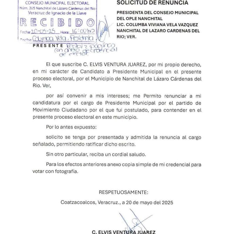 Esta semana, Elvis Ventura Juárez, candidato del partido Movimiento Ciudadano (MC) a la presidencia municipal de Nanchital, renunció a su postulación en medio de señalamientos por presuntos vínculos con grupos criminales y amenazas recibidas por parte de una célula delictiva identificada como La Mayiza.