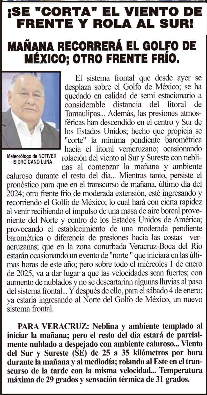 PRIMERA ¡SE "CORTA" EL VIENTO DE FRENTE Y ROLA AL SUR! - MAÑANA RECORRERÁ EL GOLFO DE MÉXICO; OTRO FRENTE FRÍO. 30 diciembre 2024 Más Noticias ¡ASESINAN A EX CANDIDATO A LA ALCALDÍA DE MISANTLA! - *Era del Movimiento Ciudadano ¡HOMENAJE PÓSTUMO AL “PAPO”! ¡SE VA EL FOFO! - DEL PRI LA ENCUESTA | - FELICIDADES! ¡SE DESCARRILA EL TREN! - PA’SUSTO ¡YA NO COBRARÁN PARQUÍMETROS! ¡SE VAN POR LAS NUBES LOS PAVOS! ¡DETECTAR DISFAGIA A TIEMPO PREVIENE LAS COMPLICACIONES DE SALUD: IMSS VERACRUZ NORTE! ¡CUATRO MUNICIPIOS SUBIRÁN EL PREDIAL! - YA SE SUPO ¡CUMBRE DE TRANSPORTE MULTIMODAL!