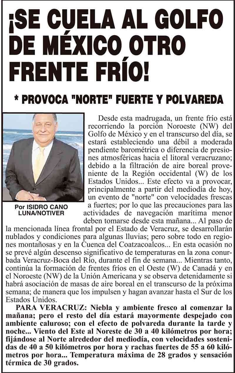 PRIMERA ¡SE CUELA AL GOLFO DE MÉXICO OTRO FRENTE FRÍO! * PROVOCA "NORTE" FUERTE Y POLVAREDA 23 febrero 2024 Más Noticias ¡YA HAY TERNA! - RAÚL PEIMBERT EN LA LISTA ¡“CEMENTERIO”! - DE ULÚAS ¡INAUGURA PATY OTRA CALLE! ¡NO LE CREYERON! - Y LO BUSCAN NOTI-MEME | - ECOS DEL INFORME! ¡VERÓNICA VA CON NAHLE! - Y AL CONGRESO ¡“FAST TRACK”! - *Mientras el Mariner salía y entraba de Pajaritos en Coatzacoalcos ¡OPERATIVO LUPE-REYES! ¡MANDAN LA BILLETIZA! - *Corea manda 150 mil dólares ¡CRISTINA GANA LA ELECCIÓN!