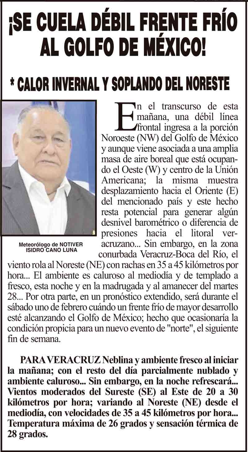 PRIMERA ¡SE CUELA DÉBIL FRENTE FRÍO AL GOLFO DE MÉXICO! - *CALOR INVERNAL Y SOPLANDO DEL NORESTE 27 enero 2025 Más Noticias ¡YA HAY TERNA! - RAÚL PEIMBERT EN LA LISTA ¡“CEMENTERIO”! - DE ULÚAS ¡INAUGURA PATY OTRA CALLE! ¡NO LE CREYERON! - Y LO BUSCAN NOTI-MEME | - ECOS DEL INFORME! ¡VERÓNICA VA CON NAHLE! - Y AL CONGRESO ¡“FAST TRACK”! - *Mientras el Mariner salía y entraba de Pajaritos en Coatzacoalcos ¡OPERATIVO LUPE-REYES! ¡MANDAN LA BILLETIZA! - *Corea manda 150 mil dólares ¡CRISTINA GANA LA ELECCIÓN!