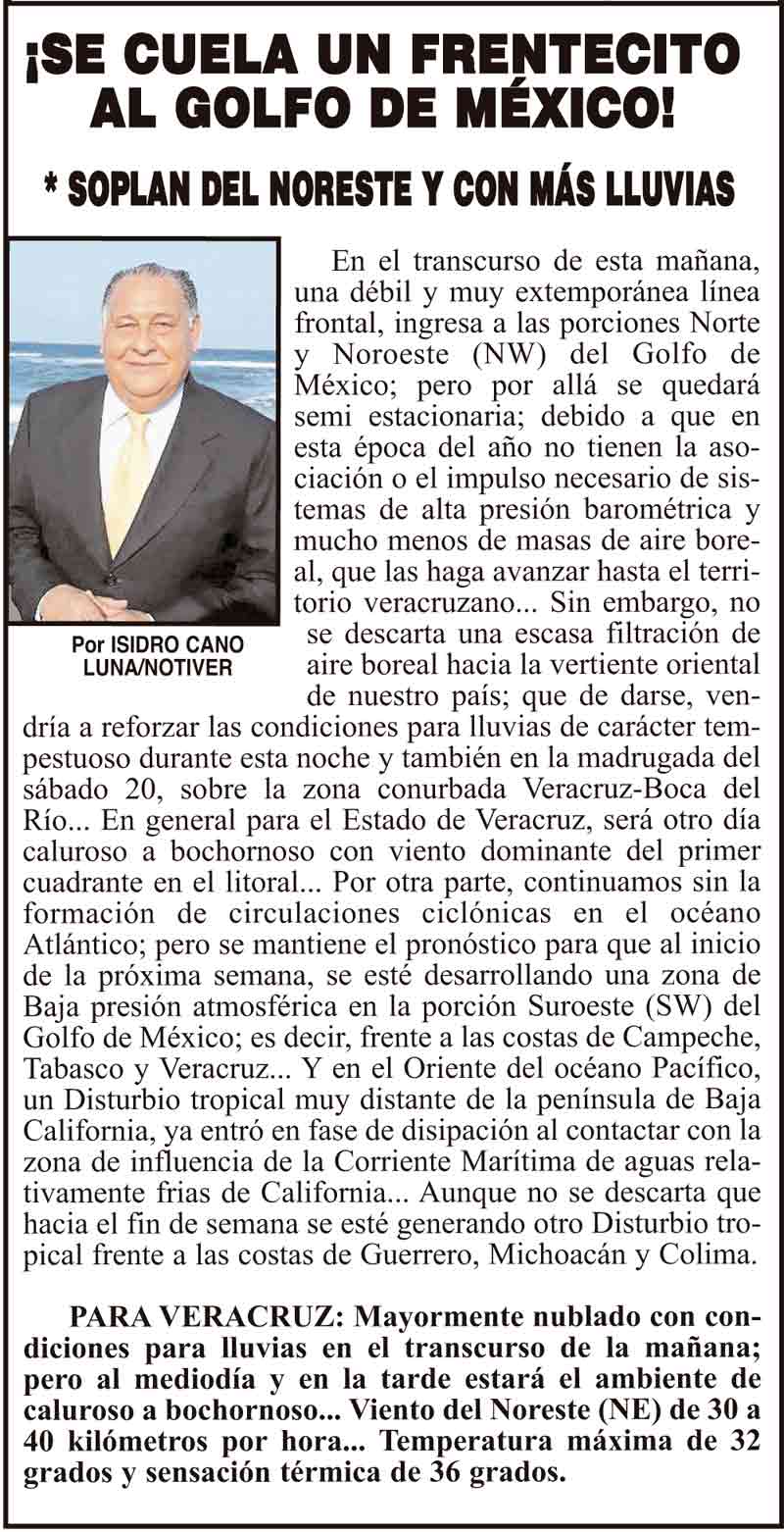 ¡SE CUELA UN FRENTECITO AL GOLFO DE MÉXICO! - *SOPLAN DEL NORESTE Y CON MÁS LLUVIAS DE NOCHE.