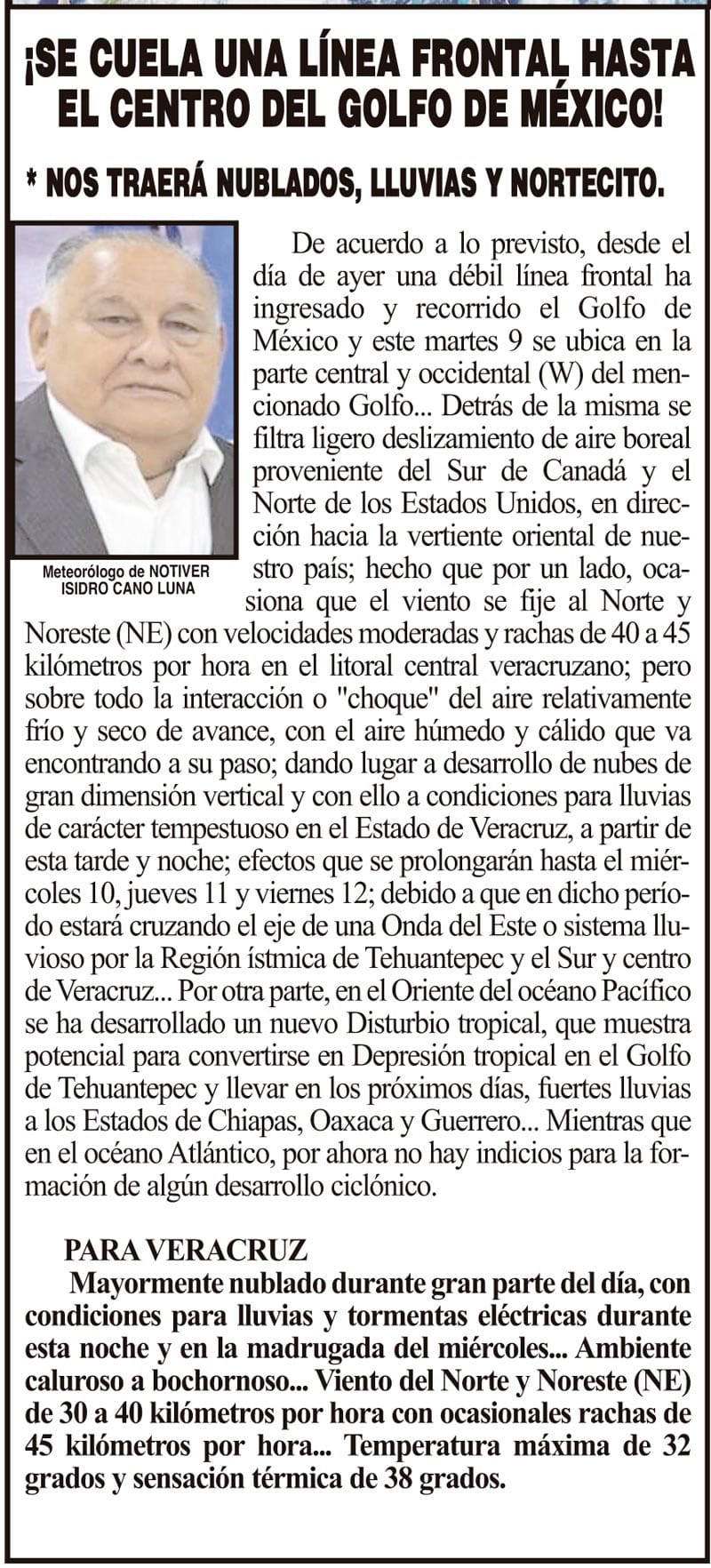 PRIMERA ¡SE CUELA UNA LÍNEA FRONTAL HASTA EL CENTRO DEL GOLFO DE MÉXICO! - *NOS TRAERÁ NUBLADOS, LLUVIAS Y NORTECITO 9 septiembre 2025 Más Noticias ¡YA HAY TERNA! - RAÚL PEIMBERT EN LA LISTA ¡“CEMENTERIO”! - DE ULÚAS ¡INAUGURA PATY OTRA CALLE! ¡NO LE CREYERON! - Y LO BUSCAN NOTI-MEME | - ECOS DEL INFORME! ¡VERÓNICA VA CON NAHLE! - Y AL CONGRESO ¡“FAST TRACK”! - *Mientras el Mariner salía y entraba de Pajaritos en Coatzacoalcos ¡OPERATIVO LUPE-REYES! ¡MANDAN LA BILLETIZA! - *Corea manda 150 mil dólares ¡CRISTINA GANA LA ELECCIÓN!
