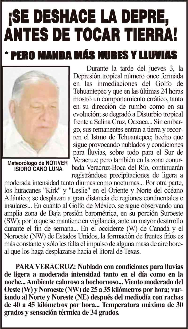 PRIMERA ¡SE DESHACE LA DEPRE, ANTES DE TOCAR TIERRA! - *PERO MANDA MÁS NUBES Y LLUVIAS 4 octubre 2024 Más Noticias ¡ASESINAN A EX CANDIDATO A LA ALCALDÍA DE MISANTLA! - *Era del Movimiento Ciudadano ¡HOMENAJE PÓSTUMO AL “PAPO”! ¡SE VA EL FOFO! - DEL PRI LA ENCUESTA | - FELICIDADES! ¡SE DESCARRILA EL TREN! - PA’SUSTO ¡YA NO COBRARÁN PARQUÍMETROS! ¡SE VAN POR LAS NUBES LOS PAVOS! ¡DETECTAR DISFAGIA A TIEMPO PREVIENE LAS COMPLICACIONES DE SALUD: IMSS VERACRUZ NORTE! ¡CUATRO MUNICIPIOS SUBIRÁN EL PREDIAL! - YA SE SUPO ¡CUMBRE DE TRANSPORTE MULTIMODAL!