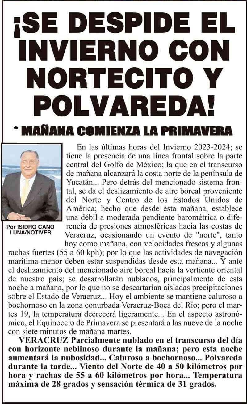 PRIMERA ¡SE DESPIDE EL INVIERNO CON NORTECITO Y POLVAREDA! - * MAÑANA COMIENZA LA PRIMAVERA 18 marzo 2024 Más Noticias ¡PUROS CALAMBRES! - AY NANITAS ¡OTRO GOLPE DE TIMÓN! - *Habrá guardias en los Registros Civiles para trámites urgentes ¡LE METIÓ ENEDINO 10 MILLONES DE PESOS A LA EDUCACIÓN EN JAMAPA! ¡MUERE FOTOPERIODISTA! - *Ramiro Cárdenas Acua conocido como El Fotógrafo ¡BBVA ESTÁ ABRIENDO CUENTAS DE NÓMINA SIN AVAL DE LA SEV! ¡YA TIENE 32 AÑOS LA ASIPONA! ¡LOS RECORDARÁN! ¡MÁS PROYECTOS COMERCIALES EN ZONA CONURBADA! ¡NO SE LOGRÓ! - *Mujeres ganan 53 alcaldías, pero los hombres se quedan con 158 ¡QUIEREN CHAMBA!