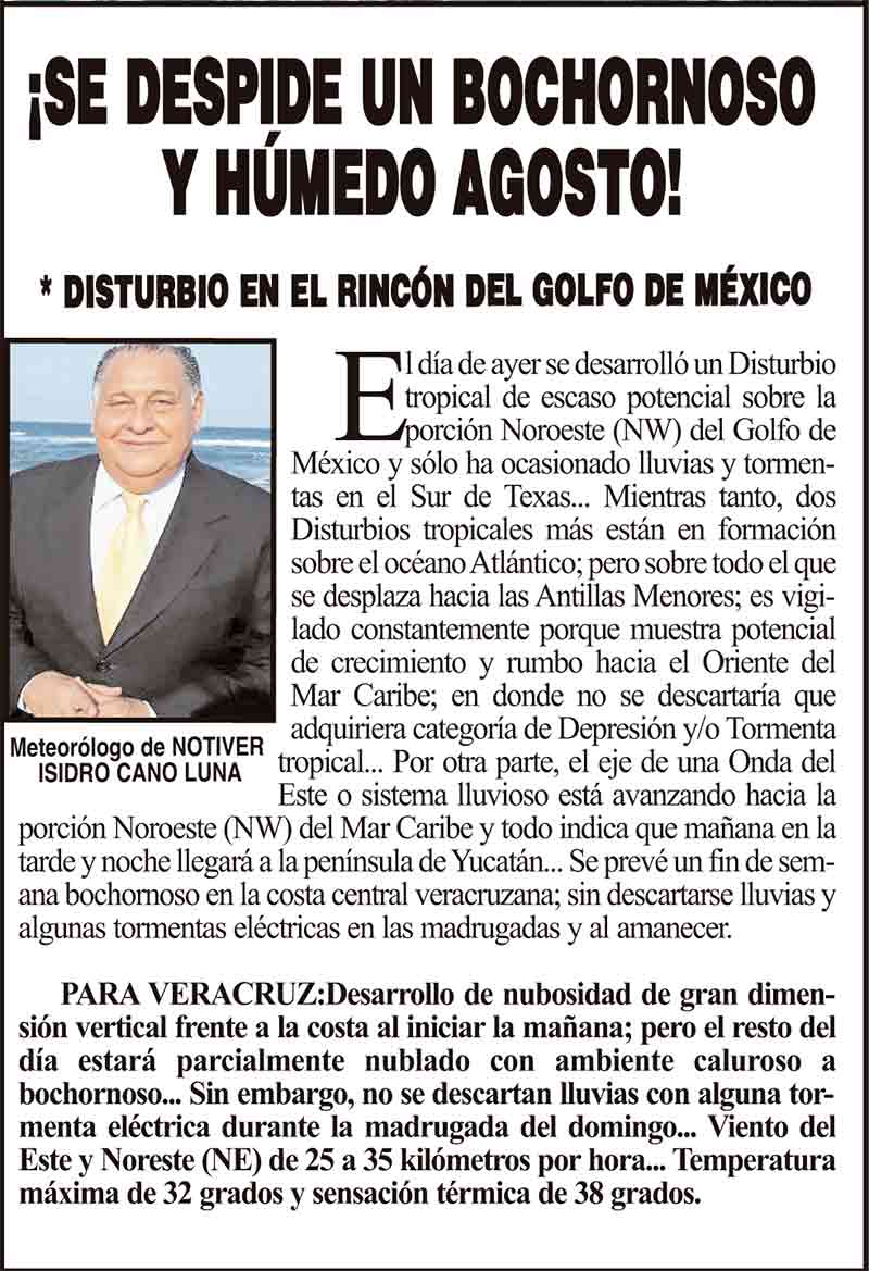 PRIMERA ¡SE DESPIDE UN BOCHORNOSO Y HÚMEDO AGOSTO! - *DISTURBIO EN EL RINCÓN DEL GOLFO DE MÉXICO 31 agosto 2024 Más Noticias ¡YA HAY TERNA! - RAÚL PEIMBERT EN LA LISTA ¡“CEMENTERIO”! - DE ULÚAS ¡INAUGURA PATY OTRA CALLE! ¡NO LE CREYERON! - Y LO BUSCAN NOTI-MEME | - ECOS DEL INFORME! ¡VERÓNICA VA CON NAHLE! - Y AL CONGRESO ¡“FAST TRACK”! - *Mientras el Mariner salía y entraba de Pajaritos en Coatzacoalcos ¡OPERATIVO LUPE-REYES! ¡MANDAN LA BILLETIZA! - *Corea manda 150 mil dólares ¡CRISTINA GANA LA ELECCIÓN!