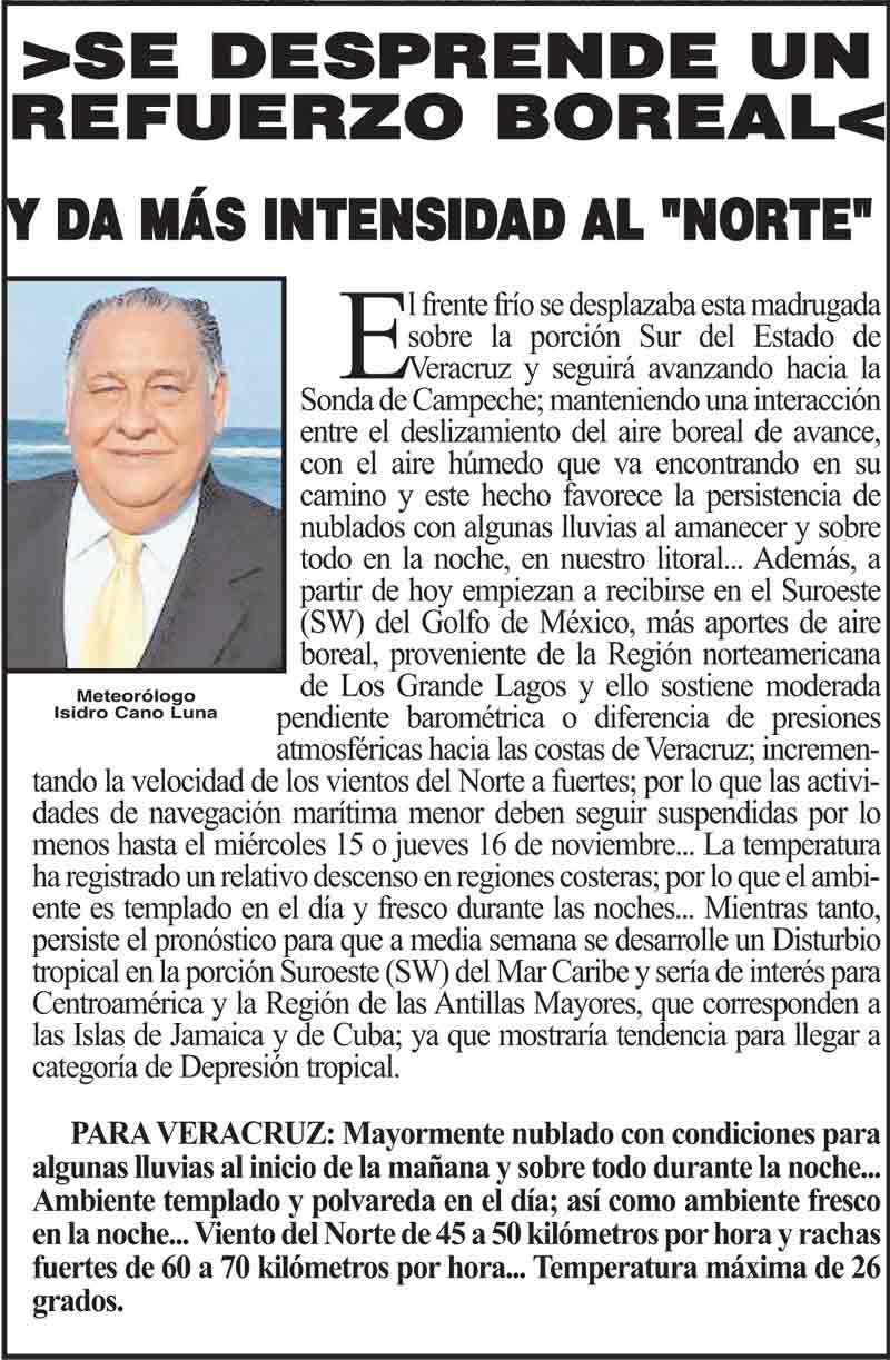 PRIMERA >SE DESPRENDE UN REFUERZO BOREAL< Y DA MÁS INTENSIDAD AL "NORTE" 13 noviembre 2023 Más Noticias ¡ASESINAN A LUIS MARIO! - EN LERDO ¡HASTA EL 2040! - PA’SUMECHA ¡LLEGAN TONELADAS DE SARGAZO! - *A playas de Veracruz y Boca del Río, el mayor en 14 años ¡SERÁ OTRO EL WTC! - ÁNDALE ¡CORTARÁN EL AGUA! - *Por mantenimiento afectará colonias ¡VAN 5 REESTRUCURAS! - *De Fidel a Nahle ¡PLAZA FANTASMA! - AY NANITAS ¡ÚLTIMA HORA! ¡CHAMBEAN HASTA DE NOCHE! ¡PIDE TRANSPARENCIA! - MC