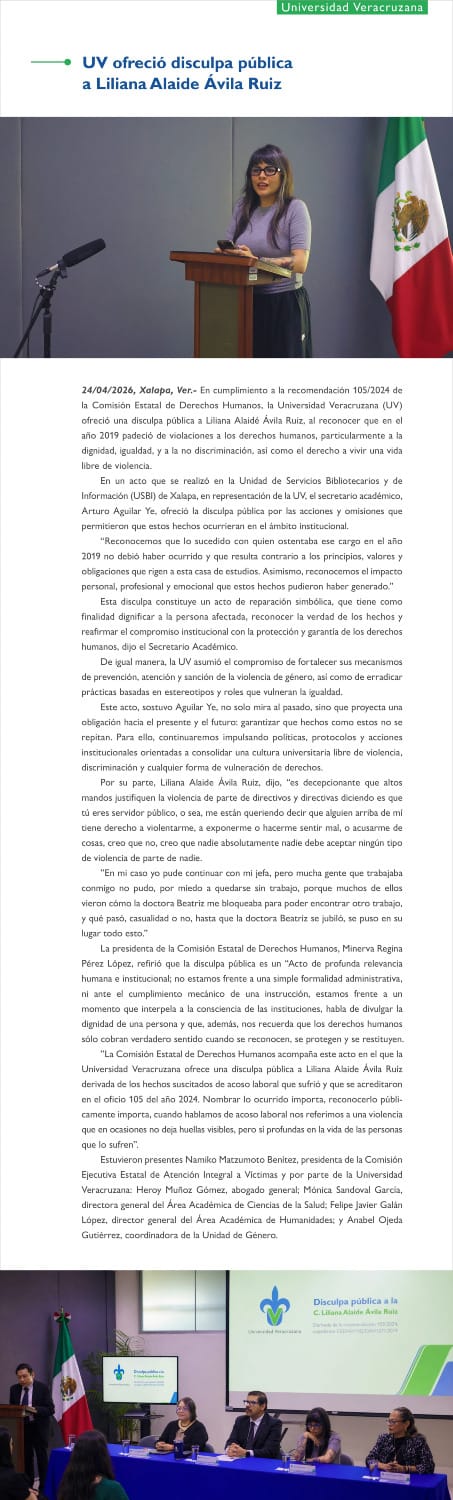 En cumplimiento a la recomendación 105/2024 de la Comisión Estatal de Derechos Humanos, la Universidad Veracruzana (UV) ofreció una disculpa pública a Liliana Alaidé Ávila Ruiz, al reconocer que en el año 2019 padeció de violaciones a los derechos humanos, particularmente a la dignidad, igualdad, y a la no discriminación, así como el derecho a vivir una vida libre de violencia.
