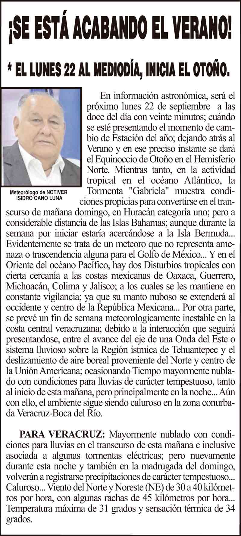 PRIMERA ¡SE ESTÁ ACABANDO EL VERANO! - *EL LUNES 22 AL MEDIODÍA, INICIA EL OTOÑO. 20 septiembre 2025 Más Noticias LA ENCUESTA | - ME ESTÁS OYENDO INÚTIL?... ¡CON BAILONGOS QUIEREN AYUDAR A LOS DAMNIFICADOS DEL NORTE! - *El mismo Alor, toca los timbales ¡YA SE LA APROBARON! - REFORMA PARA LA FISCALÍA ESTATAL NOTI-MEME | - ASÍ ESTUVO EL INFORME... ¡MÁS DE 9 MIL MILLONES! - *Eso costaría cancelar en Veracruz al Grupo MAS ¡LE DAN LUZ VERDE! - DESDE GUATEMALA ¡EL CUARTO! ¡Y COM-PA-RE-CIÓ! - ÁNDALE... ¡NO SE VA LISBETH AURELIA! - *Descarta ir a la Fiscalía y que seguirá como magistrada ¡CREAN EL SÚPER MAÍZ!