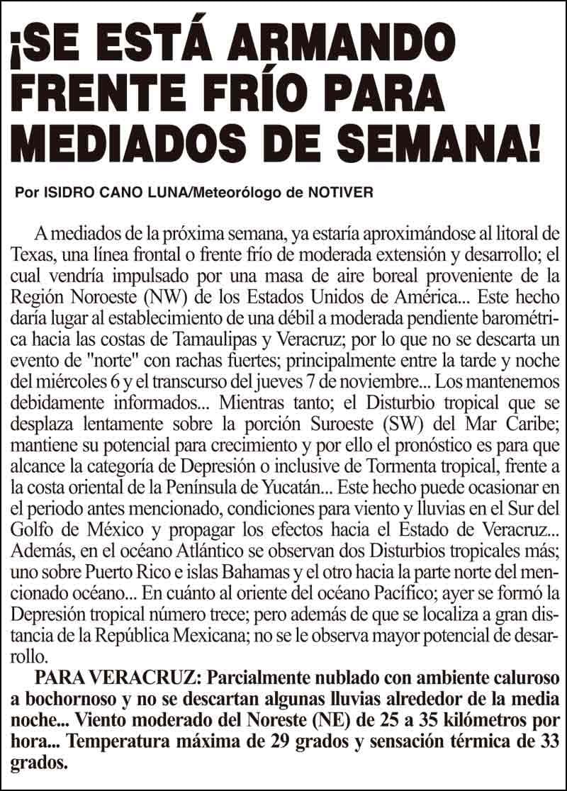 PRIMERA ¡SE ESTÁ ARMANDO FRENTE FRÍO PARA MEDIADOS DE SEMANA! - TEMPERATURA MÁXIMA DE 29 GRADOS Y SENSACIÓN TÉRMICA DE 33 GRADOS. 2 noviembre 2024 Más Noticias ¡YA HAY TERNA! - RAÚL PEIMBERT EN LA LISTA ¡“CEMENTERIO”! - DE ULÚAS ¡INAUGURA PATY OTRA CALLE! ¡NO LE CREYERON! - Y LO BUSCAN NOTI-MEME | - ECOS DEL INFORME! ¡VERÓNICA VA CON NAHLE! - Y AL CONGRESO ¡“FAST TRACK”! - *Mientras el Mariner salía y entraba de Pajaritos en Coatzacoalcos ¡OPERATIVO LUPE-REYES! ¡MANDAN LA BILLETIZA! - *Corea manda 150 mil dólares ¡CRISTINA GANA LA ELECCIÓN!