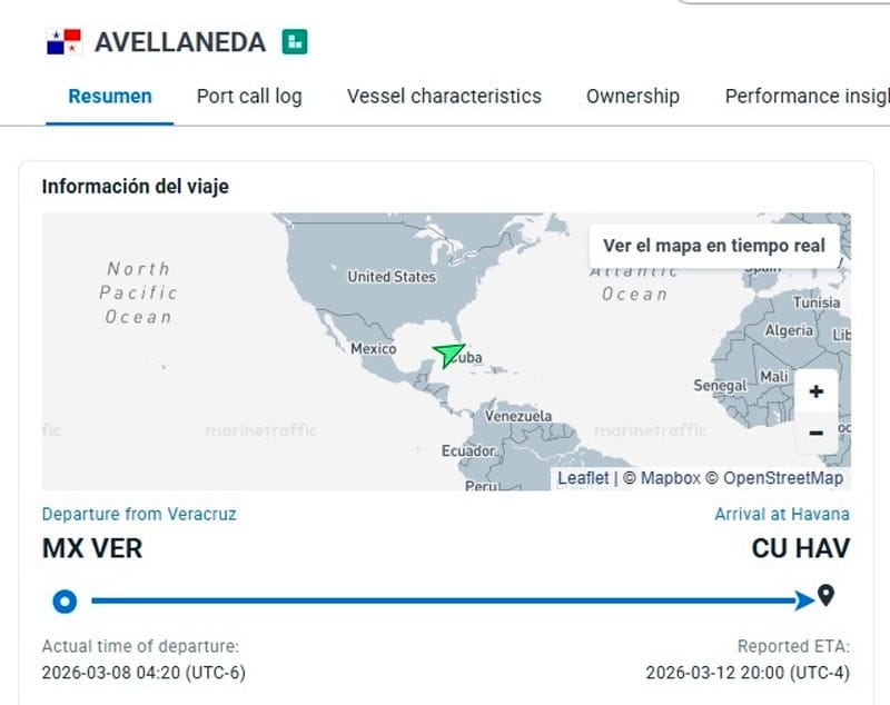 Trasciende la partida del buque granelero Avellaneda, sale de este puerto de Veracruz y llega a La Habana en Cuba, zarpó el pasado 8 de marzo a las 4:20, en la madrugada, este jueves se reportó su arribo a la isla a las 20 horas.
