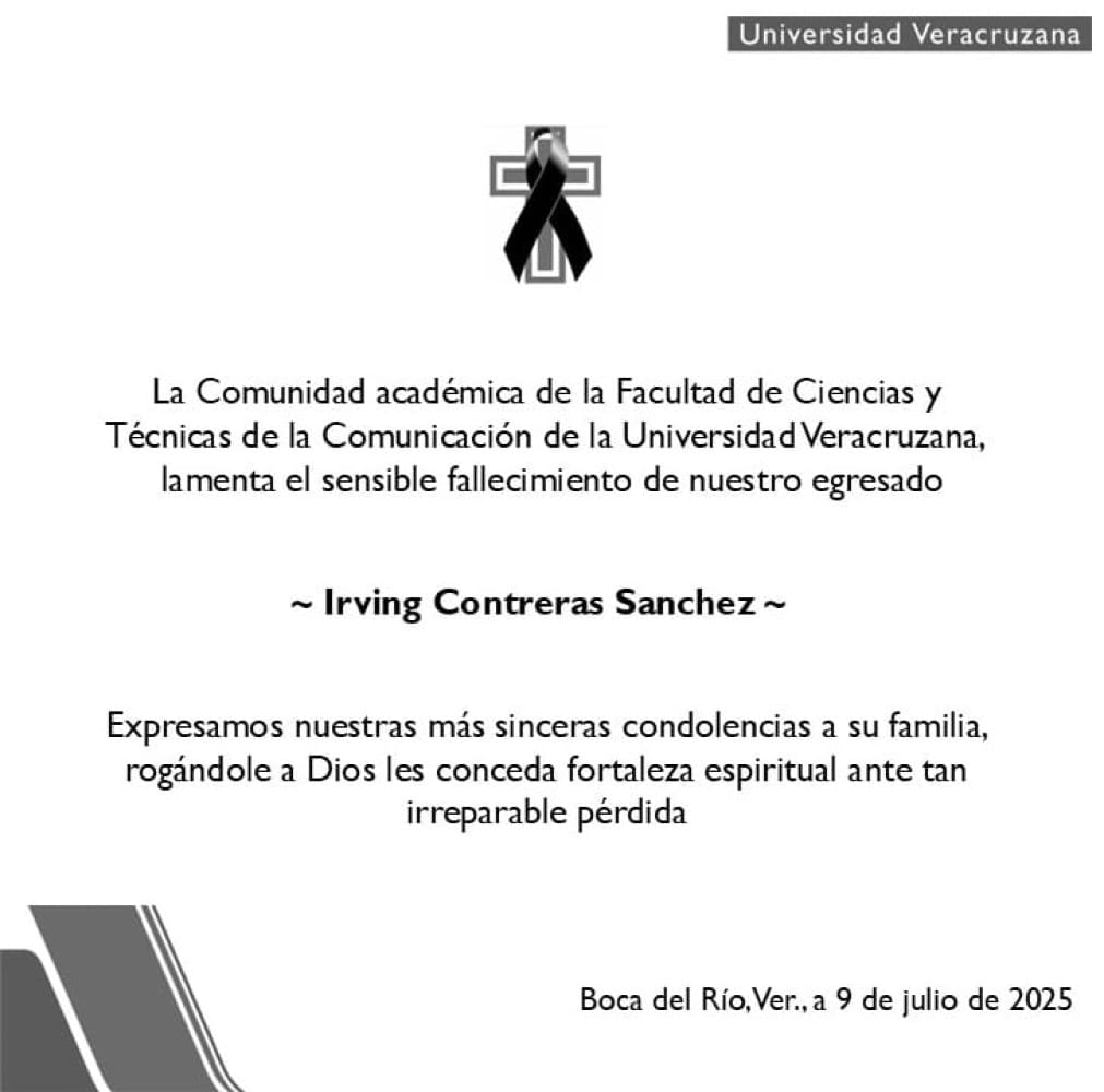 El egresado de la carrera de Ciencias de la Comunicación de la Universidad Veracruzana región Veracruz – Boca del Río, Irving Contreras Sánchez falleció este miércoles dejando tristeza y consternación en su familia, amigos y en el círculo social donde se desenvolvió profesionalmente.