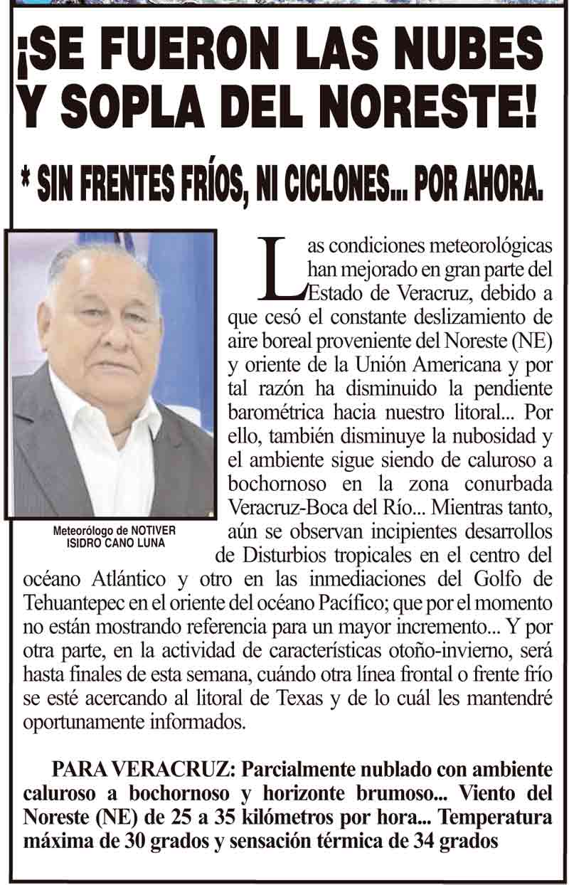 PRIMERA ¡SE FUERON LAS NUBES Y SOPLA DEL NORESTE! - *SIN FRENTES FRÍOS, NI CICLONES... POR AHORA. 13 octubre 2025 Más Noticias LA ENCUESTA | - ME ESTÁS OYENDO INÚTIL?... ¡CON BAILONGOS QUIEREN AYUDAR A LOS DAMNIFICADOS DEL NORTE! - *El mismo Alor, toca los timbales ¡YA SE LA APROBARON! - REFORMA PARA LA FISCALÍA ESTATAL NOTI-MEME | - ASÍ ESTUVO EL INFORME... ¡MÁS DE 9 MIL MILLONES! - *Eso costaría cancelar en Veracruz al Grupo MAS ¡LE DAN LUZ VERDE! - DESDE GUATEMALA ¡EL CUARTO! ¡Y COM-PA-RE-CIÓ! - ÁNDALE... ¡NO SE VA LISBETH AURELIA! - *Descarta ir a la Fiscalía y que seguirá como magistrada ¡CREAN EL SÚPER MAÍZ!