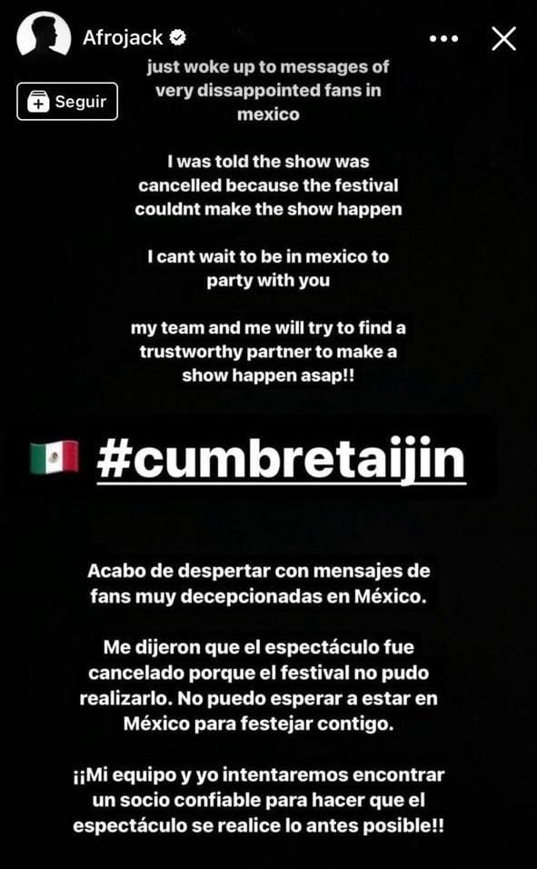 "Acabo de despertarme con mensajes de fans muy decepcionados en México, me dijeron que el espectáculo fue cancelado porque el festival no pudo realizarlo, no puedo esperar estar en México para festejarlo contigo, mi equipo y yo intentamos encontrar un socio confiable para hacer que el espectáculo se realice lo antes posible", escribió.