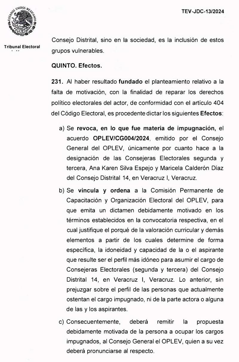 En dichas sentencias, se revocó el acuerdo OPLEV/CG004/2024, emitido por el Consejo General del OPLE Veracruz a través del cual se designó a las Presidencias, Secretarías, Vocalías y Consejerías de los 30 Consejos Distritales del OPLE.